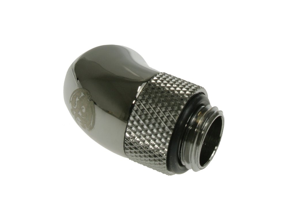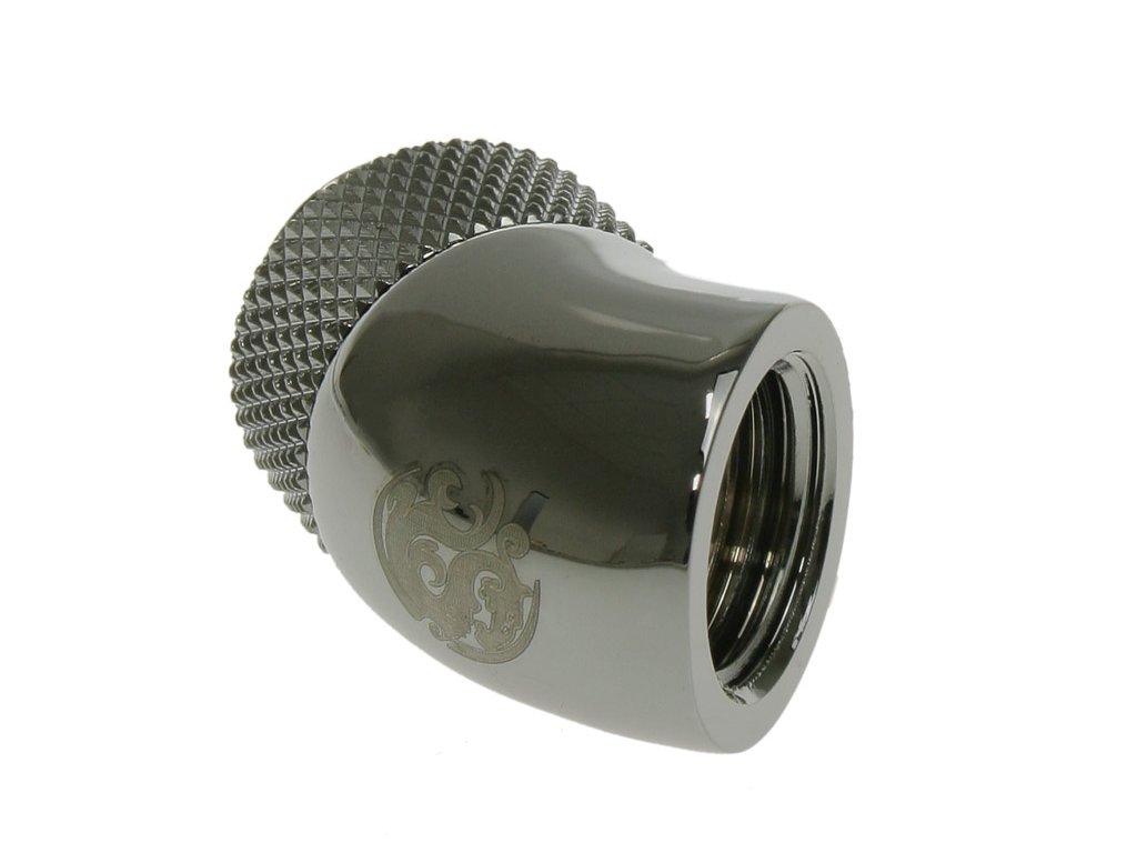 Ide o čierne poniklované a šikmé predĺženie závitu zo závitu G1/4 palca na vnútorný závit G1/4 palca v "skutočnom Hi-Flow dizajne". Prípojka má uhol 45 stupňov a dá sa otočiť na stranu skrutkového závitu. To výrazne uľahčuje inštaláciu a umožňuje presné zarovnanie.
