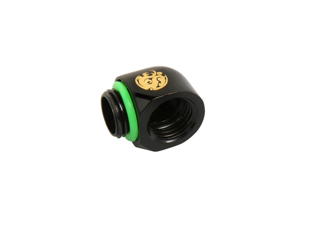 Ide o matný čierny adaptér zo závitu G1/4 palca na vnútorný závit G1/4 palca. Spojenie má uhol 90 stupňov. Boky sú zdobené dvoma nálepkami Bitspower - dodatočná vychytávka pre úpravcov so zmyslom pre detail.