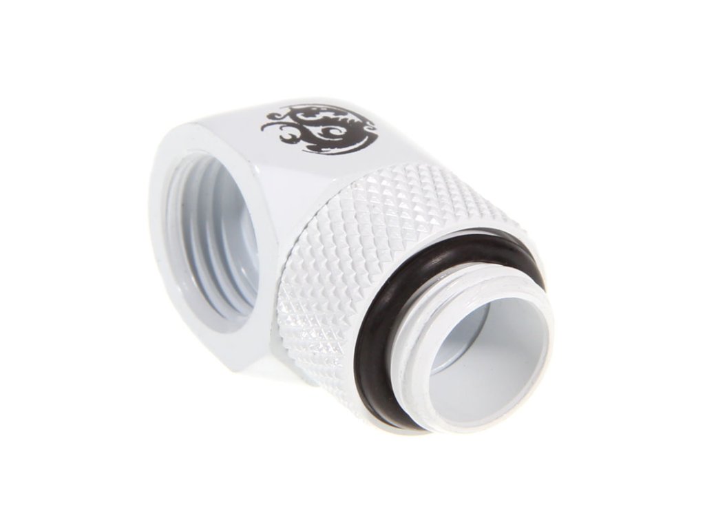 Toto je biely adaptér zo závitu G1/4 palca na vnútorný závit G1/4 palca. Spojenie má uhol 90 stupňov. Dodatočnú flexibilitu poskytuje otočný mechanizmus, ktorý výrazne uľahčuje inštaláciu a umožňuje presné zarovnanie. Boky zdobia dve nálepky Bitspower - dodatočná vychytávka pre úpravcov so zmyslom pre detail.