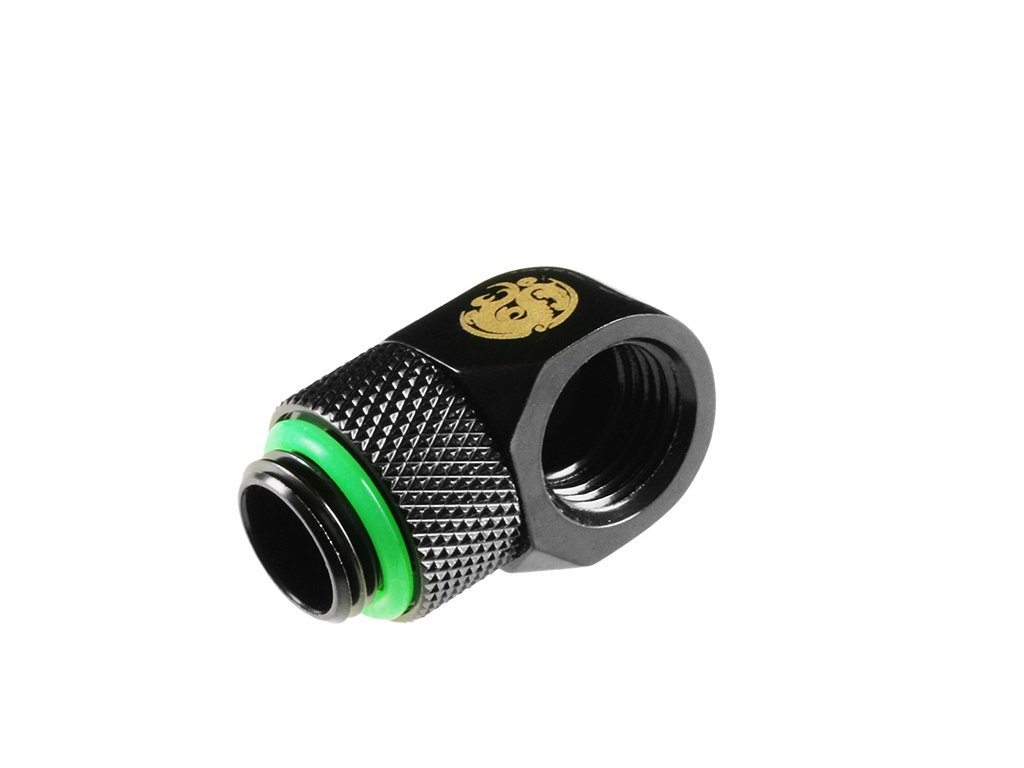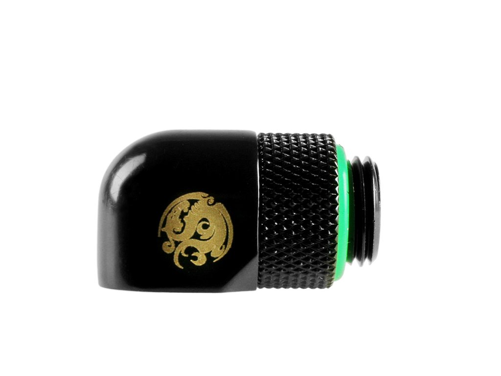 Ide o matný čierny adaptér zo závitu G1/4 palca na vnútorný závit G1/4 palca. Spojenie má uhol 90 stupňov. Dodatočnú flexibilitu poskytuje otočný mechanizmus, ktorý výrazne uľahčuje inštaláciu a umožňuje presné zarovnanie. Boky zdobia dve nálepky Bitspower - dodatočná vychytávka pre úpravcov so zmyslom pre detail.