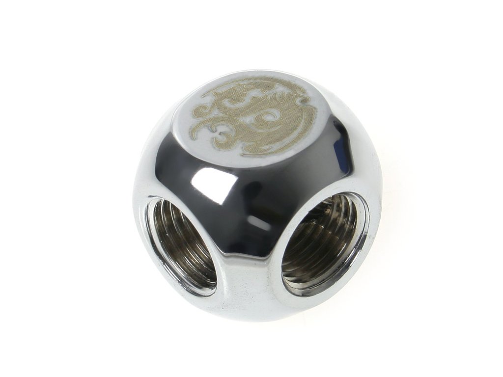 Ide o pevný T-adaptér v tvare kocky s tromi vnútornými závitmi G1/4 palca v striebornom poniklovanom vyhotovení. Táto konštrukcia umožňuje rovnomerné rozdelenie chladiaceho okruhu, pričom sa musí podľa toho opäť uzavrieť, čo si v každom prípade vyžaduje ďalší adaptér. Dve protiľahlé, uzavreté strany kocky sú ozdobené dekoratívnym kmeňom.
