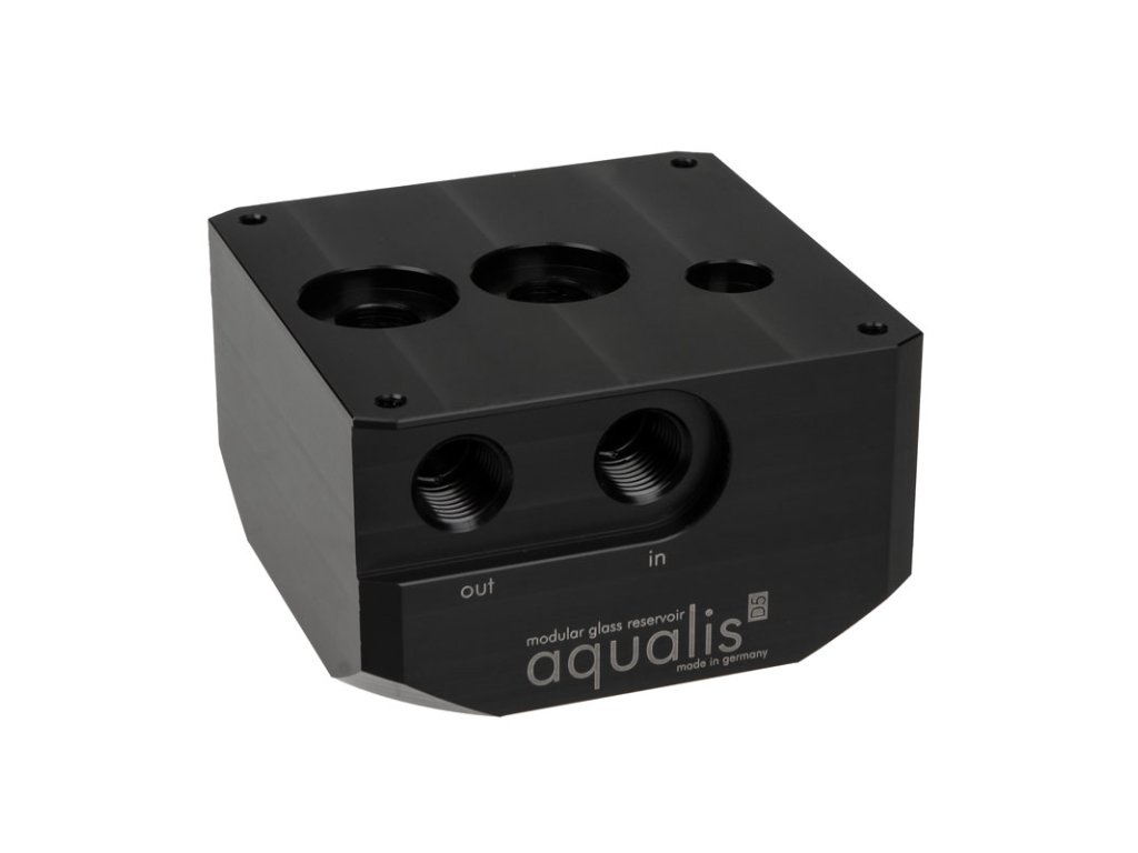 Tento adaptér čerpadla D5 od spoločnosti aqua computer je vyrobený z vysoko odolného delrínu a ponúka flexibilné možnosti pripojenia a inštalácie. Adaptér čerpadla možno použiť buď samostatne, alebo v spojení s vhodnou expanznou nádržou aqualis. Súčasťou balenia je prídržná doska z nehrdzavejúcej ocele na montáž na počítač alebo do počítača a je možné namontovať aj oddeľovaciu súpravu (nie je súčasťou balenia). Súčasťou dodávky je montážny krúžok z eloxovaného hliníka a vhodné tesnenie na montáž čerpadla D5.SMontáž adaptéra čerpadla bez expanznej nádrže pripojovacie závity G1/4 palca sú k dispozícii na hornej strane adaptéra čerpadla a na bočnej strane; nepoužité koncové závity sú utesnené dvoma priloženými skrutkovými zátkami.