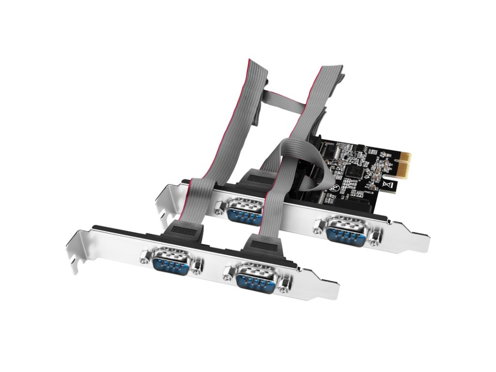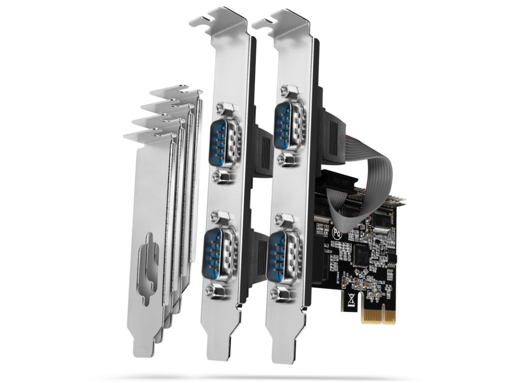 Táto karta adaptéra PCI 2.0 x1 odAXAGON poskytuje štyri sériové porty RS-232 s konektormi DB9. Na rozširujúcej karte je nainštalovaná osvedčená čipová súprava ASIX AX99100, ktorá zabezpečuje najvyššiu možnú kompatibilitu. Čip je automaticky rozpoznaný systémom Windows. Príslušné nízkoprofilové kryty slotov sú súčasťou dodávky.Technické údaje: