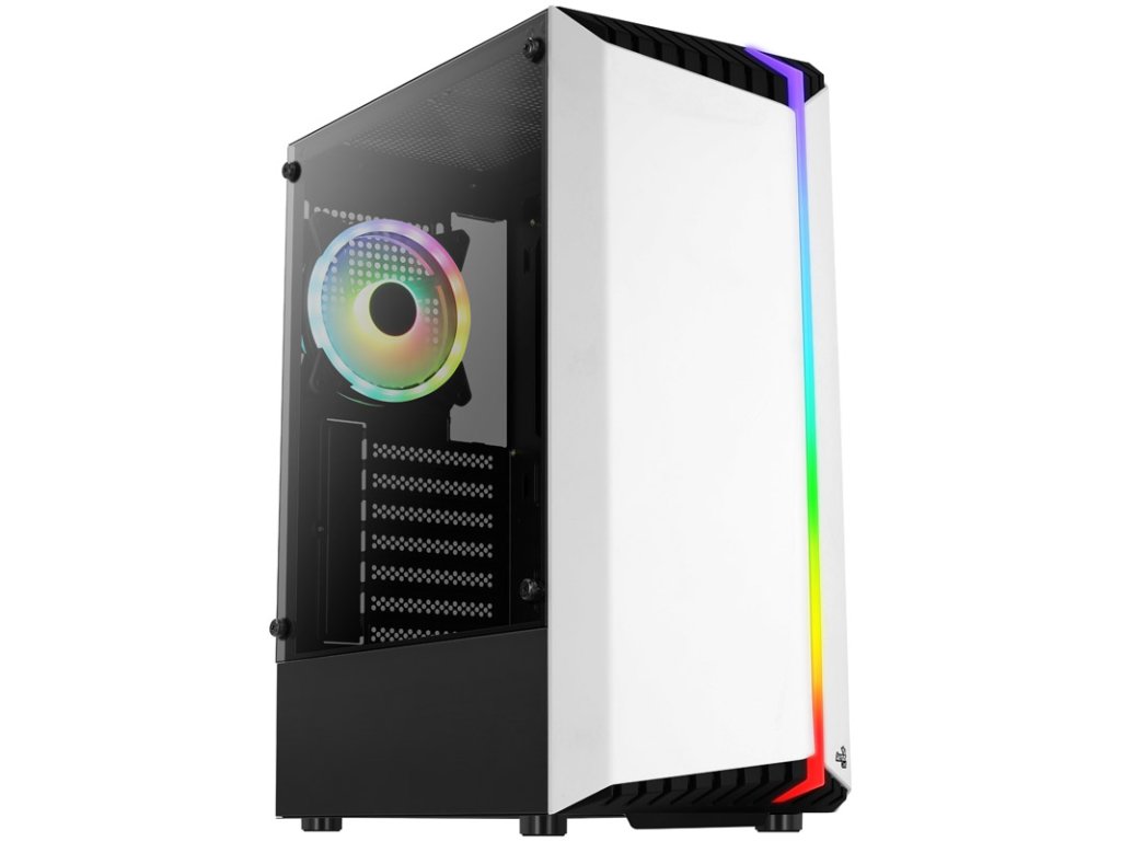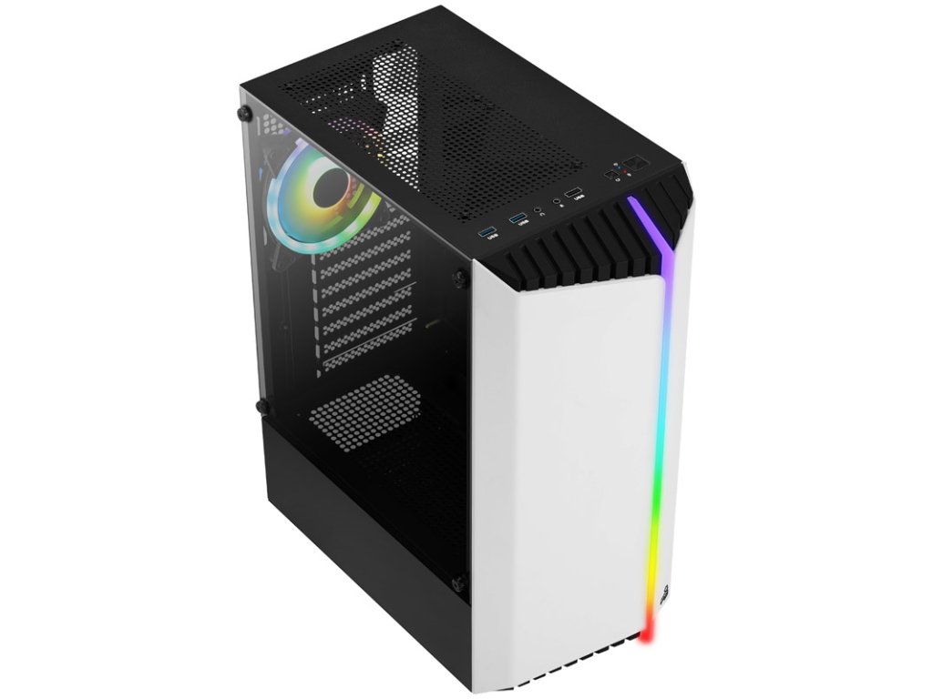StránkaAerocool Bionic v2 je dodávaný s ukážkovými prvkami vo formáte midi veže. Biela plastová predná časť sa vyznačuje pútavým dizajnom. Zvislý pásik RGB osvetľuje prednú časť s veľkým efektom.Na veku sa nachádza I/O panel s dvoma portami USB 3.0 a tlačidlom na ovládanie svetelných efektov. Tlačidlo možno použiť namedzi 36 režimami osvetlenia je možné vybrať. Hneď vedľa neho sa nachádza veľký bočný panel z tvrdeného skla, ktorý poskytuje pohľad na vnútro oceľového šasi a hardvér, ktorý je v ňom nainštalovaný.