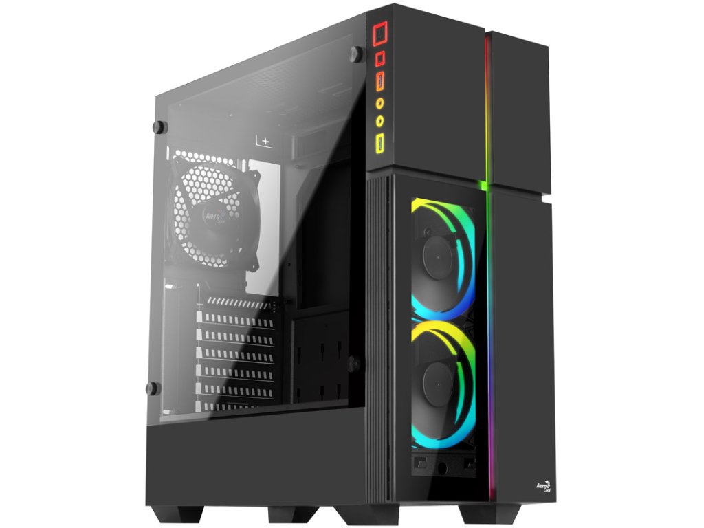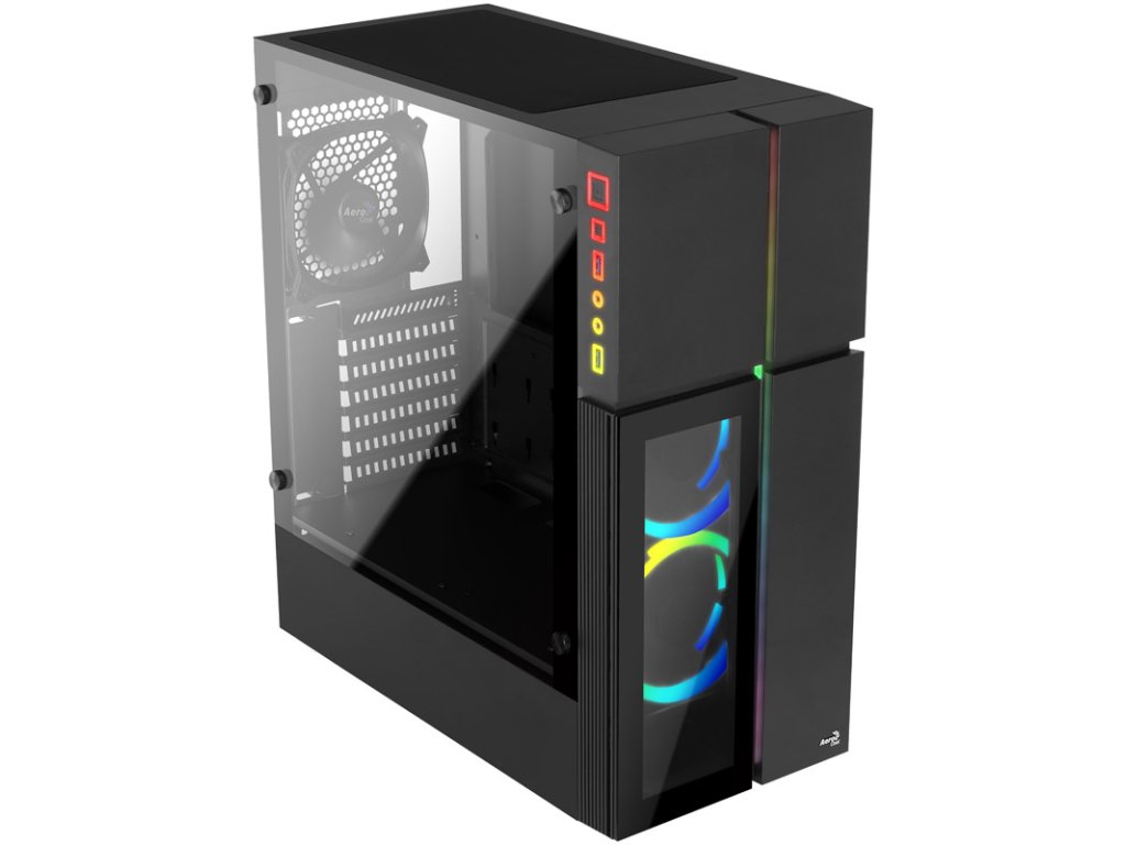 Čierna midi veža pre úsporné systémy má nápadne štýlový dizajn konzoly, kryt napájacieho zdroja a veľkorysé možnosti chladenia vzduchom vrátane predného panelu s pásikom RGB LED a oknom z tvrdeného skla. Prepínače na paneli I/O sú tiež podsvietené a RGB LED diódy sa ovládajú pomocou prepínača. Vďaka veľkorysému priestoru pre základné dosky Mini-ITX, Micro-ATX a ATX a grafické karty do veľkosti 376 mm možno realizovať aj plnohodnotné herné počítače.Prehľad funkcií zariadenia Aerocool Playa: