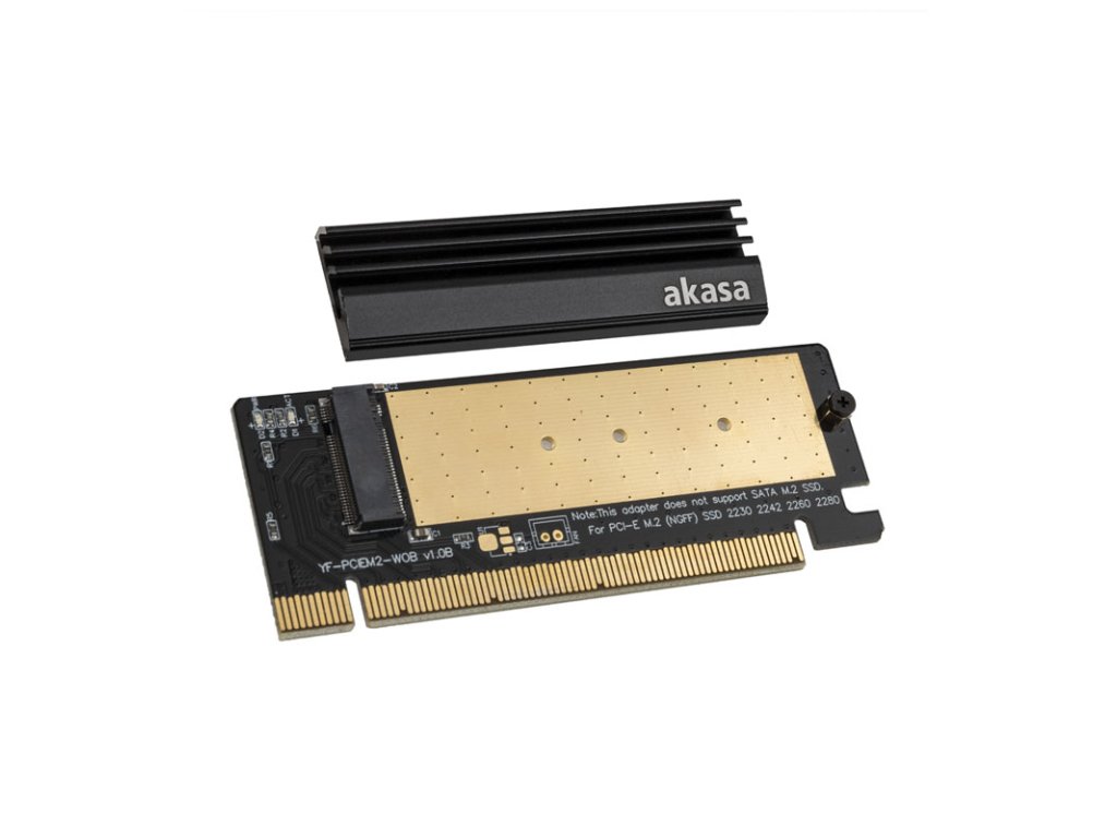 S kartou adaptéra ponúkanou tu odAkasa môže byťSSD NVMe PCIe s formátom M.2 v rozširujúcom slote PCIe x16 možno použiť. Je založený na PCIe 3.0, ale je spätne kompatibilný s PCIe 2.0. Karta je vhodná pre formáty 2230 až 2280. Vďaka svojejNízkoprofilový dizajn s výškou len 31 milimetrov je vhodný aj pre obzvlášť ploché skrine a serverové racky. PCB karty adaptéra je čierne a priložený pasívny chladič pre SSD je tiež čierny.Technické údaje: