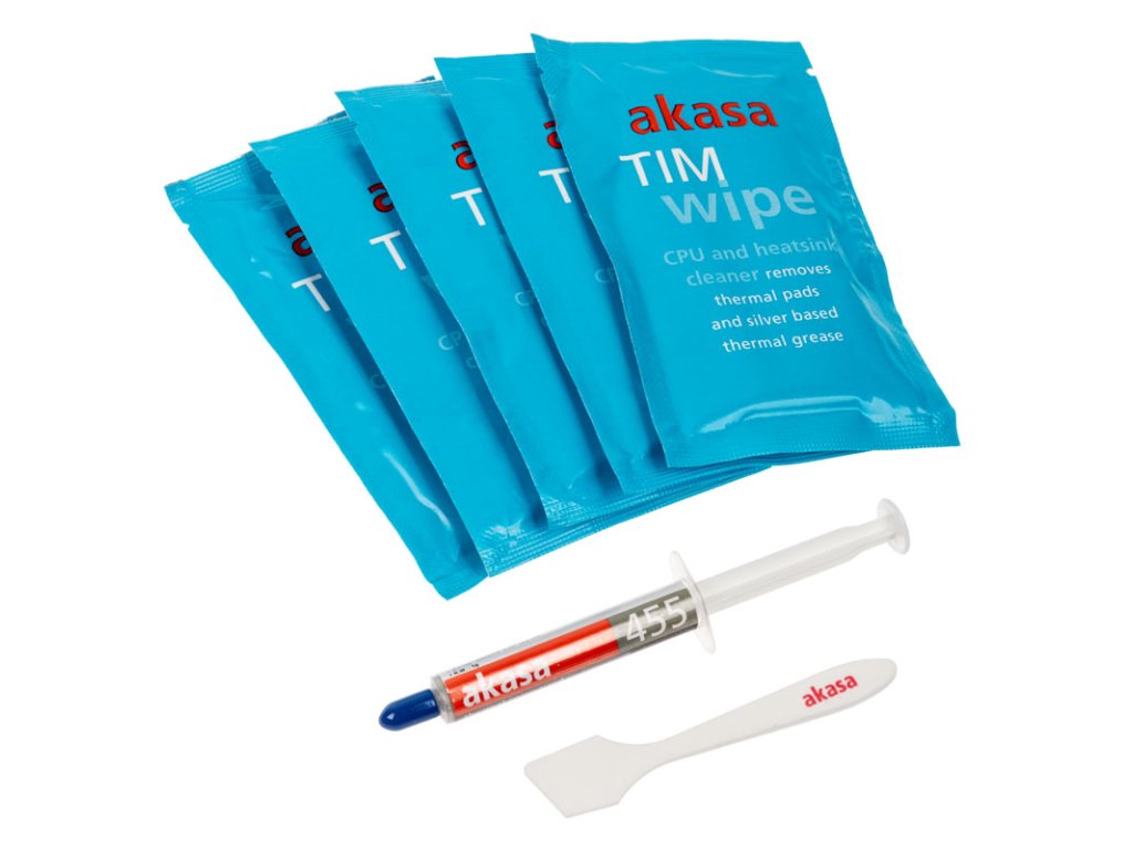Táto čistiaca súprava výrazne uľahčuje čistenie starej a nanášanie novej termálnej pasty a je ideálna pre všetkých používateľov, ktorí často menia chladič CPU. Na stránke Súprava na utieranie TIM obsahuje päť čistiacich handričiek navlhčených tekutinou Akasa Tim-Clean na odstránenie starej tepelnej pasty z CPU, GPU, čipových súprav a chladičov bez zanechania zvyškov.Súprava obsahuje ajAkasa AK-455-5G Vysoko výkonná tepelná pasta, ktorá ponúka konzistentný a spoľahlivý tepelný výkon a má vysokú tepelnú vodivosť 2,4 W/mK. Pasta sa veľmi ľahko nanáša, najmä pomocou dodanej špachtle. Vďaka optimalizovanej konzistencii sa veľmi ľahko nanáša a zaručuje optimálny prenos tepla medzi procesorom a chladičom. Pasta je elektricky nevodivá.