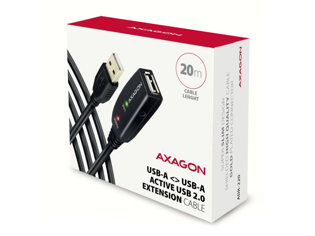 Aktívny, 20 m dlhý predlžovací kábel AXAGON ADR-220 USB 2.0, ideálny na pripojenie počítača k zariadeniam USB, ako je myš, klávesnica, webová kamera, tlačiareň, skener, plotter a iné. Aktívny kábel USB repeater zosilňuje nepretržitý signál, čo umožňuje pripojenie zariadenia USB na výrazne väčšiu vzdialenosť ako pri použití pasívnych káblov. Dosah kábla možno ešte viac predĺžiť použitím viacerých káblov v sérii.