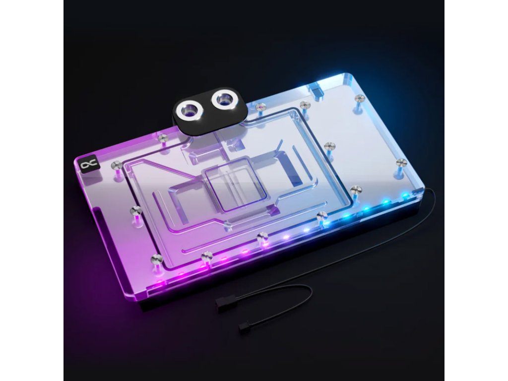 Blok jeCeloblokový dizajnktorá pokrýva všetky relevantné zdroje tepla grafickej karty a účinne tak chladí GPU, pamäť a meniče napätia. Na optimalizáciu prenosu tepla sa používa chrómovaná meď. To vám ponúka dobrý výkon aj pri vysokom pracovnom zaťažení.Veko sa skladá zpriehľadný akryl s integrovaným osvetlením RGB. Čierna zadná doska je vyrobená z hliníka, a preto zabezpečuje aj odvod tepla. Pripojovacia svorka na prednej strane má štyri závity G1/4 palca. Každý vstup a výstup je označený.