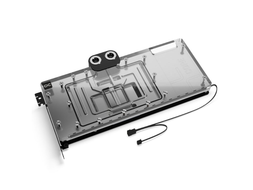 Veko sa skladá zpriehľadný akryl s integrovaným osvetlením RGB. Čierna zadná doska je vyrobená z hliníka, a preto zabezpečuje aj odvod tepla. Pripojovacia svorka na prednej strane má štyri závity G1/4 palca.