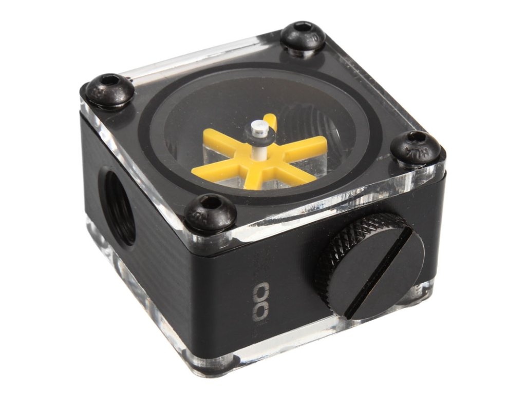 Ide o uhlový indikátor prietoku vyrobený z čierneho acetalu a akrylového skla s vnútorným závitom G1/4". Rotor ukazuje smer prúdenia a na oboch koncoch je odlišne namaľovaný. V závislosti od farby prísady do chladiacej kvapaliny možno zvoliť stranu s výraznejším kontrastom.