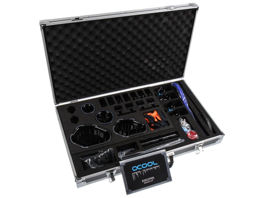 Súčasťou balenia je napríklad odihľovač na profesionálne odihlenie tvrdých rúrok po skrátení. Stabilná píla a meradlo rezu pomáhajú vykonávať čisté rezy. Meradlo rezu sa dá pomocou špeciálnych skrutkových svoriek pripevniť k okraju stola a jeho vnútorná strana je pogumovaná, aby sa zabránilo poškriabaniu a skĺznutiu tvrdých rúrok. Pomocou mnohých meracích nástrojov možno tvrdé rúry merať nielen na dĺžku, ale aj v dvoch alebo viacerých uhloch súčasne, čo výrazne uľahčuje plánovanie a ohýbanie.Na ohýbacom plechu možno nastaviť široký rozsah polomerov a uhlov ohybu. Základom sú tu dva rôzne veľké ohýbacie podávače a kruhové ohýbacie podávače. Na ohýbacom plechu sa nachádza oblasť, kde možno realizovať špeciálne vytvorené alebo veľmi špeciálne ohýbacie tvary. Skriňa obsahuje aj špeciálne ohýbacie podávače, ktoré možno umiestniť takmer kdekoľvek. Namiesto jednoduchého ohýbania na 2D ploche dodáva spoločnosť Alphacool v tomto prípade flexibilné 45° a 90° ohýbacie podpery. To umožňuje realizovať uhly od povrchu smerom nahor.