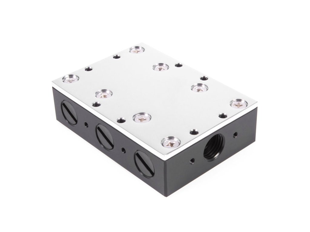 S touto rozdeľovacou doskou máte k dispozícii celkom 14 možností pripojenia vo formáte G1/4 palca s 5 mm hlbokým závitom. Na každej dlhšej strane sú tri pripojenia, na hornej strane šesť a na každom konci jeden pripojovací závit. Treba poznamenať, že všetky pripojenia sú usporiadané v pároch. To znamená, že je možné použiť iba horné alebo bočné pripojenie. Prípojky na čelných stranách sú výnimkou. Tu sa môže použiť bočné, horné alebo príslušné spojenie na boku.Distroplate môžete namontovať v ľubovoľnom počte v sérii, čo poskytuje väčšiu variabilitu a jednoduché vedenie hadíc, najmä pri použití v serveroch. Vďaka rôznym možnostiam konfigurácie možno k Distroplate pohodlne pripojiť všetky komponenty vodného okruhu.