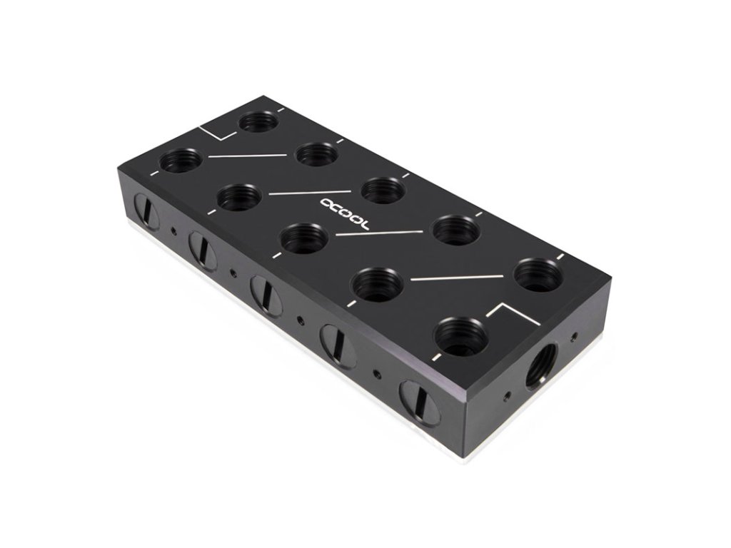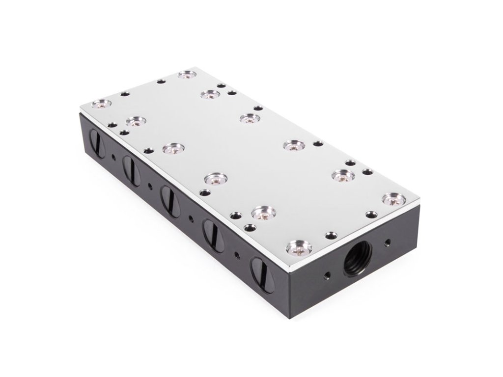 S touto rozdeľovacou doskou máte k dispozícii celkom 22 možností pripojenia vo formáte G1/4 palca s 5 mm hlbokým závitom. Na každej dlhšej strane je päť pripojení, na hornej strane 10 a na každom konci jeden pripojovací závit. Treba poznamenať, že všetky pripojenia sú usporiadané v pároch. To znamená, že je možné použiť iba horné alebo bočné pripojenie. Prípojky na čelných stranách sú výnimkou. Tu sa môže použiť bočné, horné alebo príslušné spojenie na boku.Distroplate môžete namontovať v ľubovoľnom počte v sérii, čo poskytuje väčšiu variabilitu a jednoduché vedenie hadíc, najmä pri použití v serveroch. Vďaka rôznym možnostiam konfigurácie možno k Distroplate pohodlne pripojiť všetky komponenty vodného okruhu.