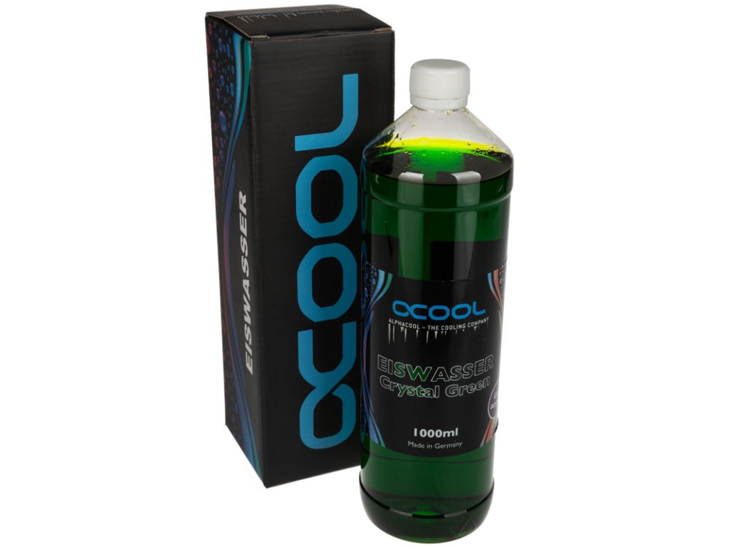 Chladiaca kvapalina pripravená na použitie z radu Eiswasser Crystal od spoločnosti Alphacool v zelenej farbe s UV reaktivitou. Fľaša obsahuje 1 000 mililitrov hotovej zmesi s vysokou materiálovou kompatibilitou a dlhotrvajúcou svietivosťou farieb.Prehľad vlastností chladiacej kvapaliny Crystal Green s UV-aktívnym ľadom: