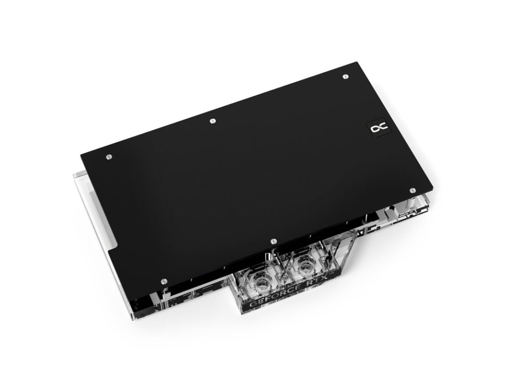 Blok jeCeloblokový dizajnktorá pokrýva všetky relevantné zdroje tepla grafickej karty a účinne tak chladí GPU, pamäť a meniče napätia. Na optimalizáciu prenosu tepla sa používa chrómovaná meď. To vám ponúka dobrý výkon aj pri vysokom pracovnom zaťažení.Veko sa skladá zpriehľadný akryl s integrovaným osvetlením RGB. Čierna zadná doska je vyrobená z hliníka, a preto zabezpečuje aj odvod tepla. Pripojovacia svorka na prednej strane má štyri závity G1/4 palca. Každý vstup a výstup je označený.