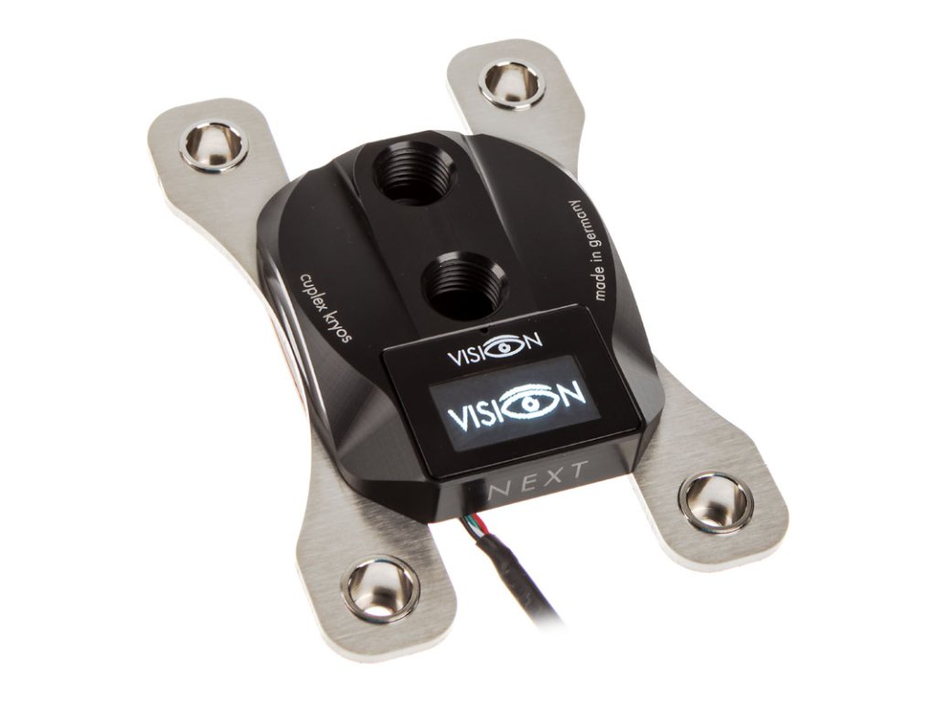 Zvláštnosťou tohto modelu chladiča cuplex kryos NEXT je ultramoderná technológia VISION, ktorá využíva snímač teploty chladiaceho média a vlastný mikroprocesor na ovládanie grafického displeja OLED integrovaného do krytu chladiča s rozlíšením 128 x 64 pixelov a zobrazuje na ňom užitočné informácie.To znamená, že meranie teploty vody je integrované priamo do chladiča a v kombinácii so softvérom aquasuite sa môže zobrazovať priamo na voľne konfigurovateľnom displeji spolu s celým radom ďalších hardvérových údajov, ako je napríklad zaťaženie procesora. Okrem rozhrania USB k počítaču a rozhrania aquabus na výmenu údajov so zariadením aquaero 5 alebo 6 je možné pripojiť aj snímač prietoku alebo alternatívne výstup alarmu. Treba však poznamenať, že do chladiča možno priviesť maximálne dva pripojovacie káble, a preto sa používateľ musí rozhodnúť, ktoré komponenty chce pripojiť.