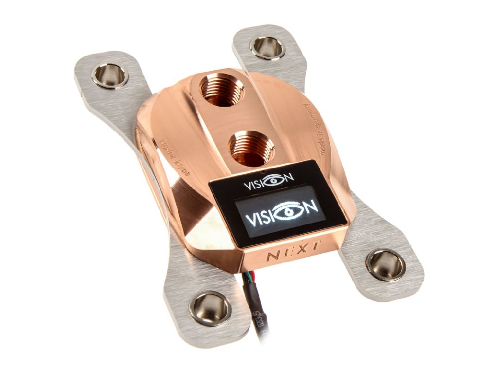 Zvláštnosťou tohto modelu chladiča cuplex kryos NEXT je ultramoderná technológia VISION, ktorá využíva snímač teploty chladiaceho média a vlastný mikroprocesor na ovládanie grafického displeja OLED integrovaného do krytu chladiča s rozlíšením 128 x 64 pixelov a zobrazuje na ňom užitočné informácie.To znamená, že meranie teploty vody je integrované priamo do chladiča a v kombinácii so softvérom aquasuite sa môže zobrazovať priamo na voľne konfigurovateľnom displeji spolu s celým radom ďalších hardvérových údajov, ako je napríklad zaťaženie procesora. Okrem rozhrania USB k počítaču a rozhrania aquabus na výmenu údajov so zariadením aquaero 5 alebo 6 je možné pripojiť aj snímač prietoku alebo alternatívne výstup alarmu. Treba však poznamenať, že do chladiča možno priviesť maximálne dva pripojovacie káble, a preto sa používateľ musí rozhodnúť, ktoré komponenty chce pripojiť.