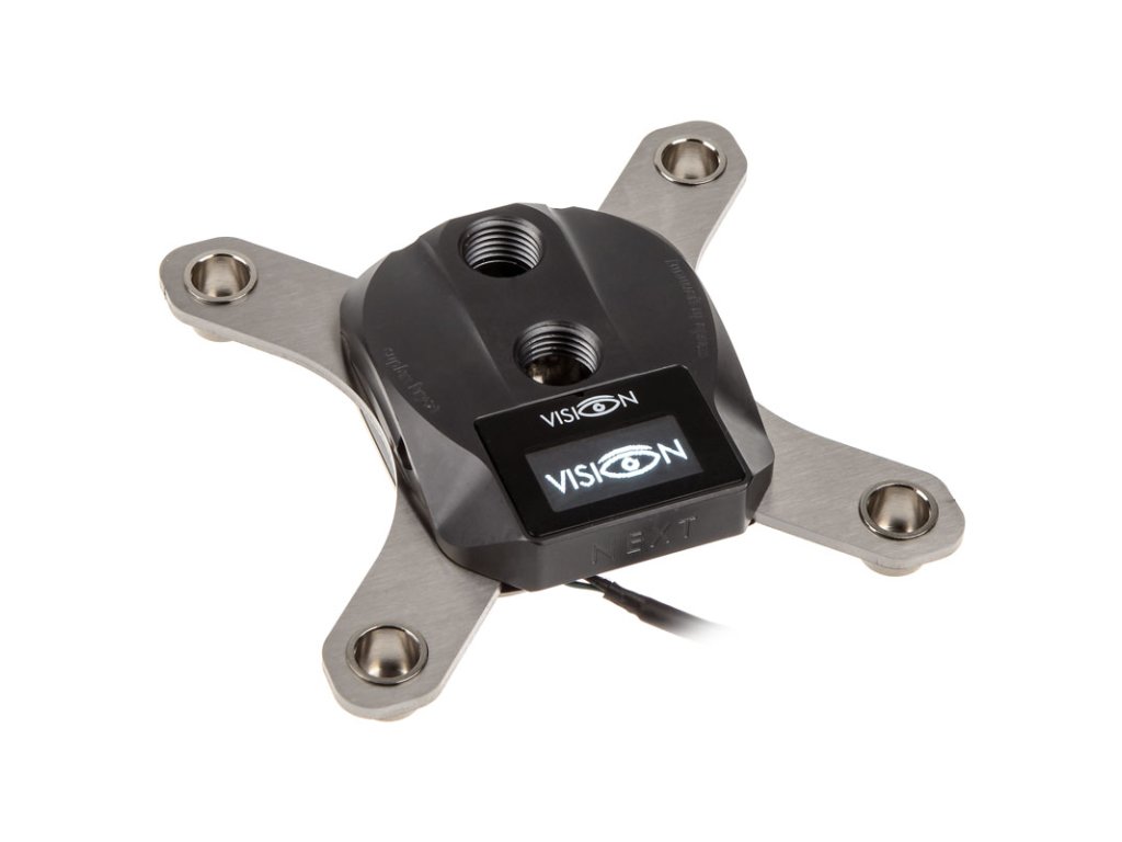 Zvláštnosťou tohto modelu chladiča cuplex kryos NEXT je ultramoderná technológia VISION, ktorá využíva snímač teploty chladiaceho média a vlastný mikroprocesor na ovládanie grafického displeja OLED integrovaného do krytu chladiča s rozlíšením 128 x 64 pixelov a zobrazuje na ňom užitočné informácie.To znamená, že meranie teploty vody je integrované priamo do chladiča a v kombinácii so softvérom aquasuite sa môže zobrazovať priamo na voľne konfigurovateľnom displeji spolu s celým radom ďalších hardvérových údajov, ako je napríklad zaťaženie procesora. Okrem rozhrania USB k počítaču a rozhrania aquabus na výmenu údajov so zariadením aquaero 5 alebo 6 je možné pripojiť aj snímač prietoku alebo alternatívne výstup alarmu. Treba však poznamenať, že do chladiča možno priviesť maximálne dva pripojovacie káble, a preto sa používateľ musí rozhodnúť, ktoré komponenty chce pripojiť.