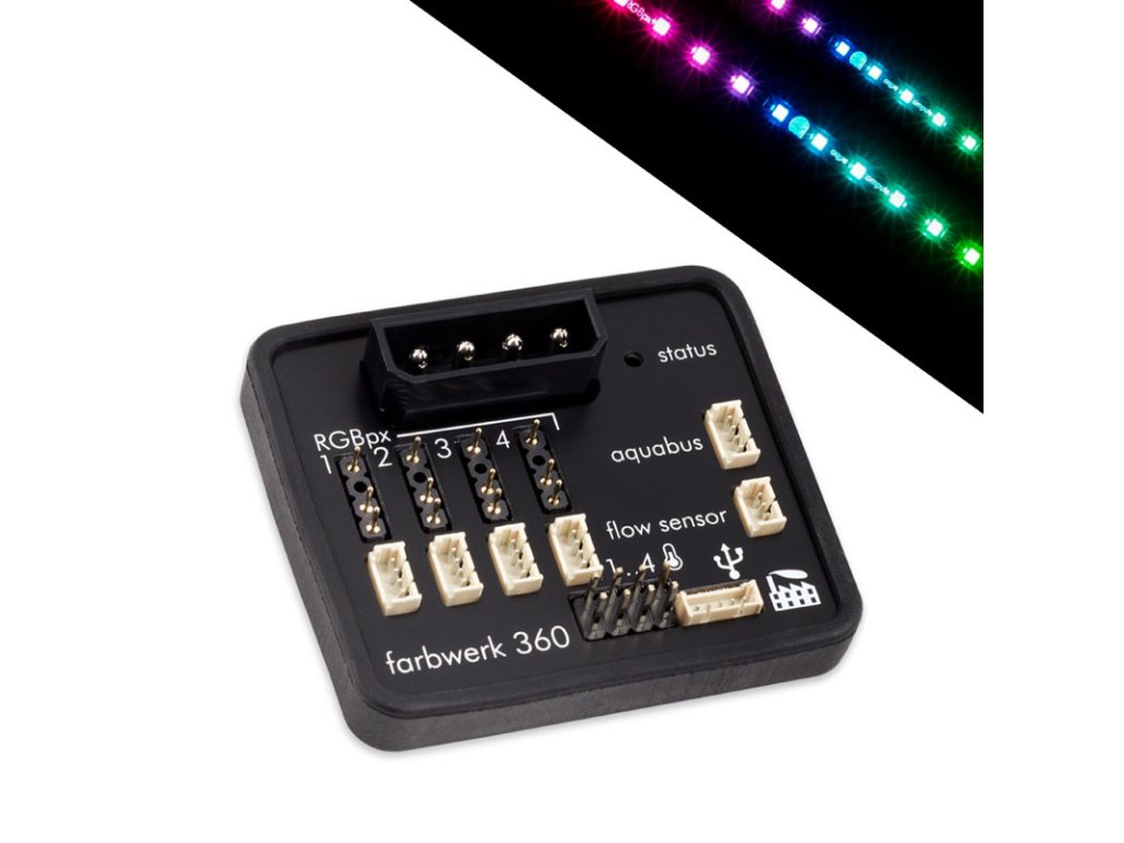 Stránkaaqua computer farbwerk 360 je RGB LED ovládač so širokou škálou funkcií. Prostredníctvom svojich štyroch kanálov môže adresovať až 360 LED diód. Okrem toho je možné pripojiť štyri snímače teploty a snímač prietoku. Portfólio funkcií dopĺňa celkovo 16 softvérových senzorov.Prehľad funkcií aqua computer farbwerk 360: