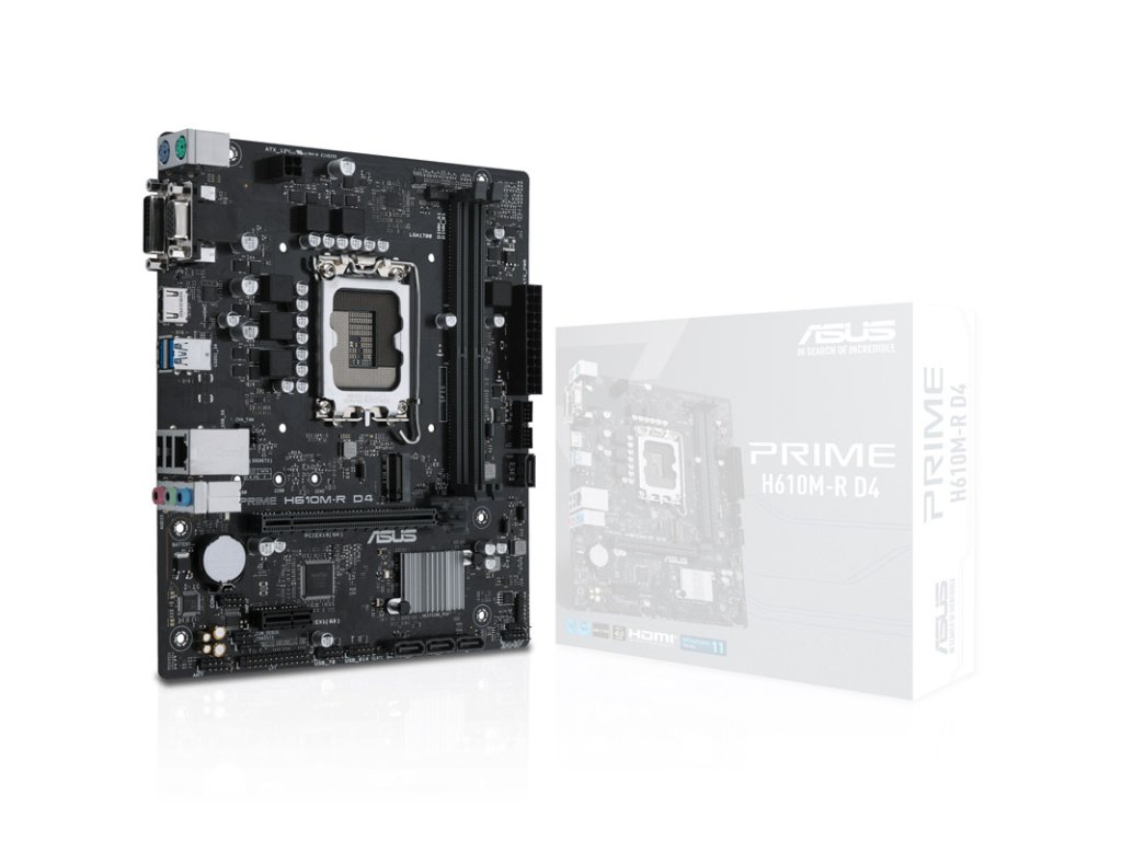 StránkaASUS Prime H610M-R D4-SI je základná doska formátu Micro-ATX sČipová súprava Intel H610 aSocket LGA 1700. Základná doska je vhodná pre procesory i-13000 a i-12000 12. a 13. generácie procesorov Intel Core,Jazero Alder a jazero Raptor ako aj procesory Pentium Gold G7000 a Celeron G6000 s integrovanou grafickou jednotkou. PodporujePamäť DDR4 s frekvenciou až 3 200 MHz a ponúka aj funkcie ako Gbit-LAN.
