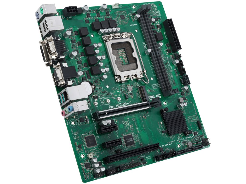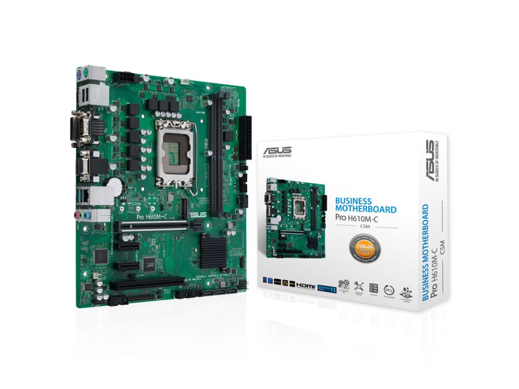 StránkaASUS PRO H610M-C-CSM je základná doska formátu Micro-ATX sČipová súprava Intel H610 aSocket LGA 1700. Základná doska je vhodná pre stolové procesory 12., 13. a 14. generácie procesorov Intel Core,Jazero Alder a jazero Raptor. PodporujePamäť DDR5 s frekvenciou až 4800 MHz a ponúka aj funkcie ako Gbit-LAN.