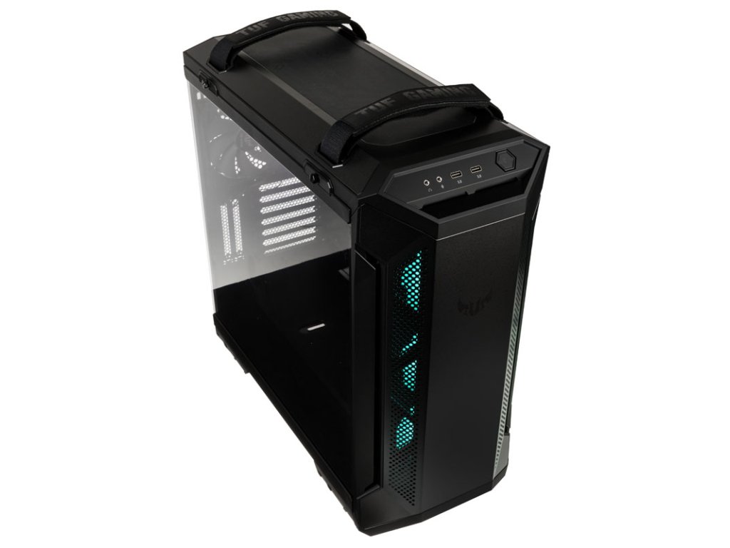 Výrazné dizajnové prvky série TUF sú zachované aj vGT501 a sú farebne doplnené svetelnými efektmi. StránkaOceľový predný panel má rovný povrch s bodkovaným povrchom a herným logom TUF. RGB LED osvetlenie troch predinštalovaných predných ventilátorov, ktoré možno ovládať prostredníctvom ASUS Aura Sync, svieti cez sieťované okraje lichobežníkového predného panela.VeľkorysýBočný panel z tvrdeného skla má hrúbku štyri milimetre a dá sa upevniť pomocou skrutiek s palcom. Vďaka čiernemu krytu napájacieho zdroja v základni skrine je vnútroASUS TUF GT501 veľmi upratané. Je tu množstvo priechodiek pre káble. Tie sa dajú usporiadať za základnou doskou pomocou suchých zipsov. Keď už hovoríme o suchých zipsoch: Dvatkané bavlnené rukoväte s celkovou nosnosťou 30 kilogramov uľahčujú prepravu veže Midi-Tower a dajú sa otvoriť a nastaviť pomocou suchých zipsov.