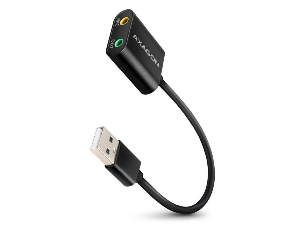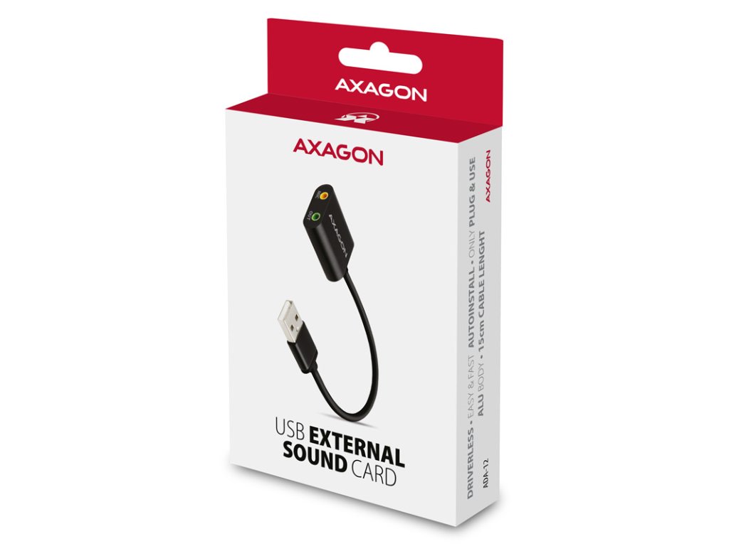 Externá zvuková karta miniAXAGON ADA-12 pridá k počítaču dve 3,5 mm jack pripojenia (MIC a OUT) cez USB v priebehu chvíľky. Táto zvuková karta je určená najmä hráčom, pretože poskytuje bezkonkurenčnú kvalitu zvuku s rozlíšením až 16 bitov / 48 kHz pri 93 dB, ktorý je počuť už od prvého tónu. Reproduktory je možné pripojiť aj priamo kAXAGON ADA-12 pripojiť. Napájanie sa uskutočňuje cez USB, pričom konektor USB typu A je na konci 15 cm dlhého kábla.Technické údaje:
