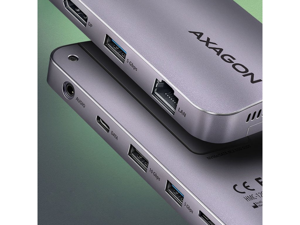 AXAGON HMC-12GM2 Viacportový rozbočovač, USB-C 3.1, M.2-NVMe/SATA, DP + HDMI, Gbit-LAN, 3x USB-A, 1x USB-C, CR