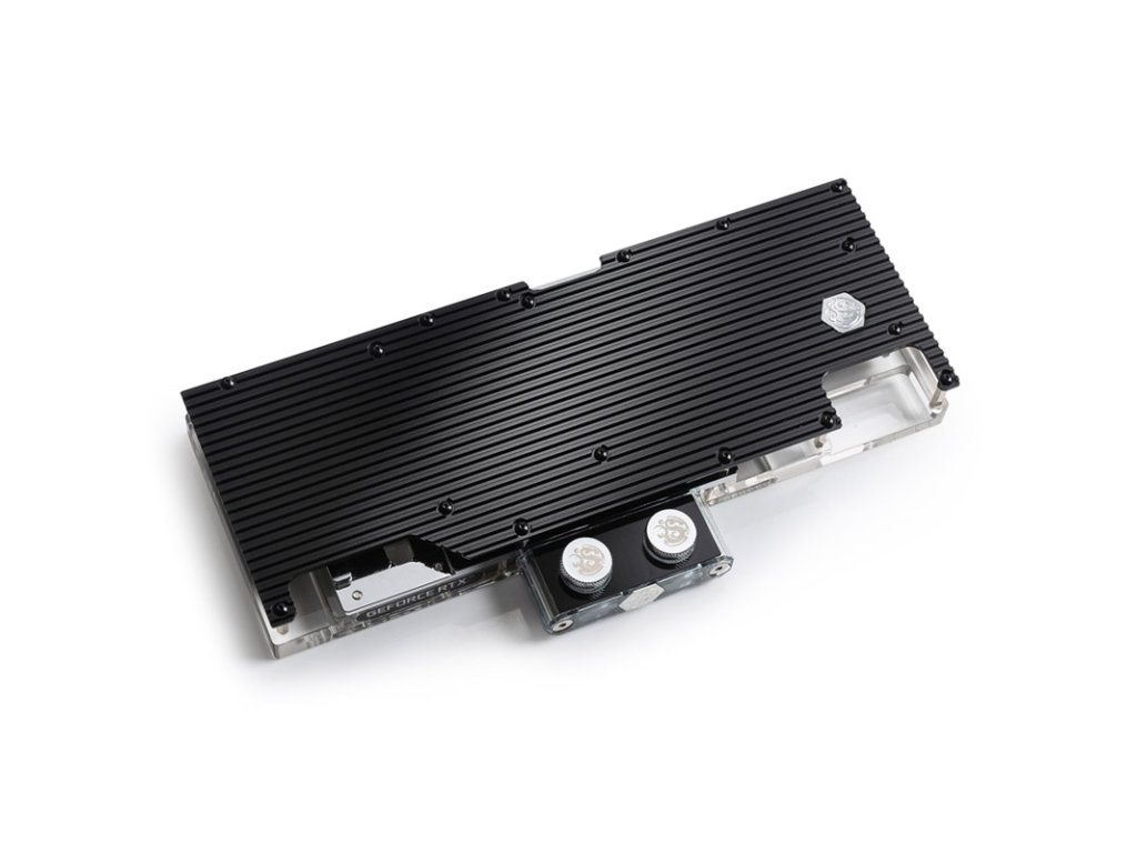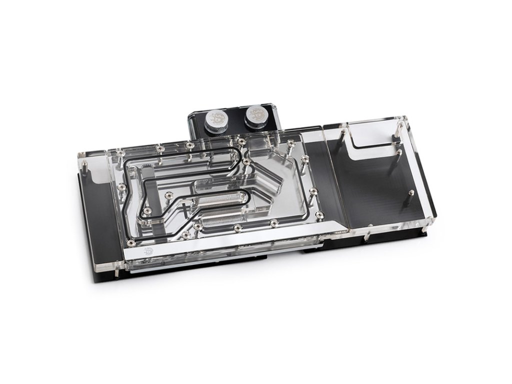 StránkaBitspower Classic je vysokokvalitný a výkonný chladič na vlastné vodné chladenie, ktorý sa hodí na dosky plošných spojov grafických kariet EVGA RTX 3090 XC3. Vďaka poniklovanému a pochrómovanému medenému bloku je zaručené účinné chladenie GPU, pamäte a meničov napätia. Priehľadný kryt z akrylového skla a integrované osvetlenie DRGB LED dodávajú chladiču štýlový vzhľad. Dodávaná zadná doska z čierneho eloxovaného hliníka zvyšuje stabilitu a prispieva k elegantnému vzhľadu chladiča.Vzhľad a pripojenia vodného chladiča Bitspower Classic