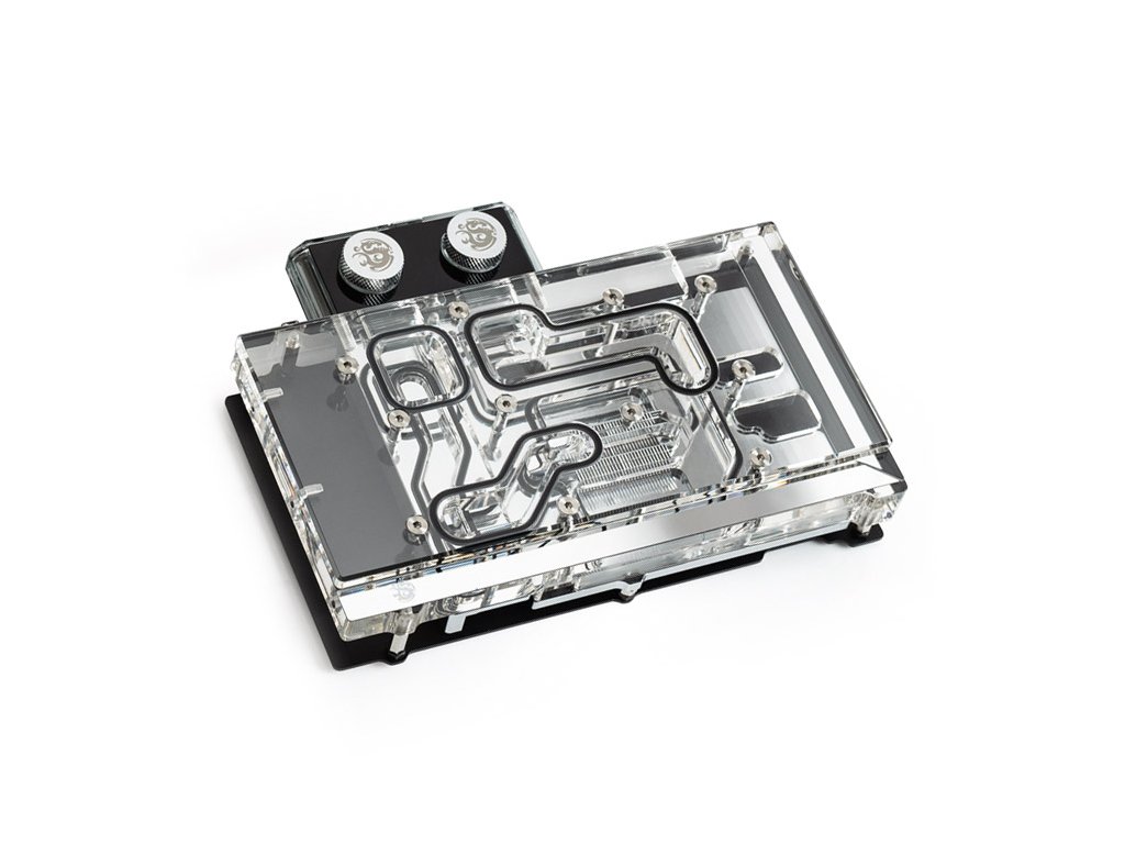Toto jeCeloblokový dizajnktorá pokrýva všetky relevantné zdroje tepla grafickej karty, a preto ich účinne chladí - t. j. GPU, pamäť a meniče napätia. Na optimalizáciu prenosu tepla sa používa poniklovaná a pochrómovaná meď.Veko sa skladá zpriehľadné akrylové skloktorý umožňuje pohľad na prúdiacu chladiacu kvapalinu. Pripojovacia svorka má štyri otvory (závit G1/4"). Plochá konštrukcia chladiča tiež uľahčuje pripojenie viacerých grafických kariet v sieti. Stránkadodávaná zadná doska je vyrobená z čierneho eloxovaného hliníka a pokrýva zadnú časť grafickej karty, čím prispieva k elegantnému vzhľadu chladiča. Zvyšuje tiež stabilitu grafickej karty s nainštalovaným chladičom.