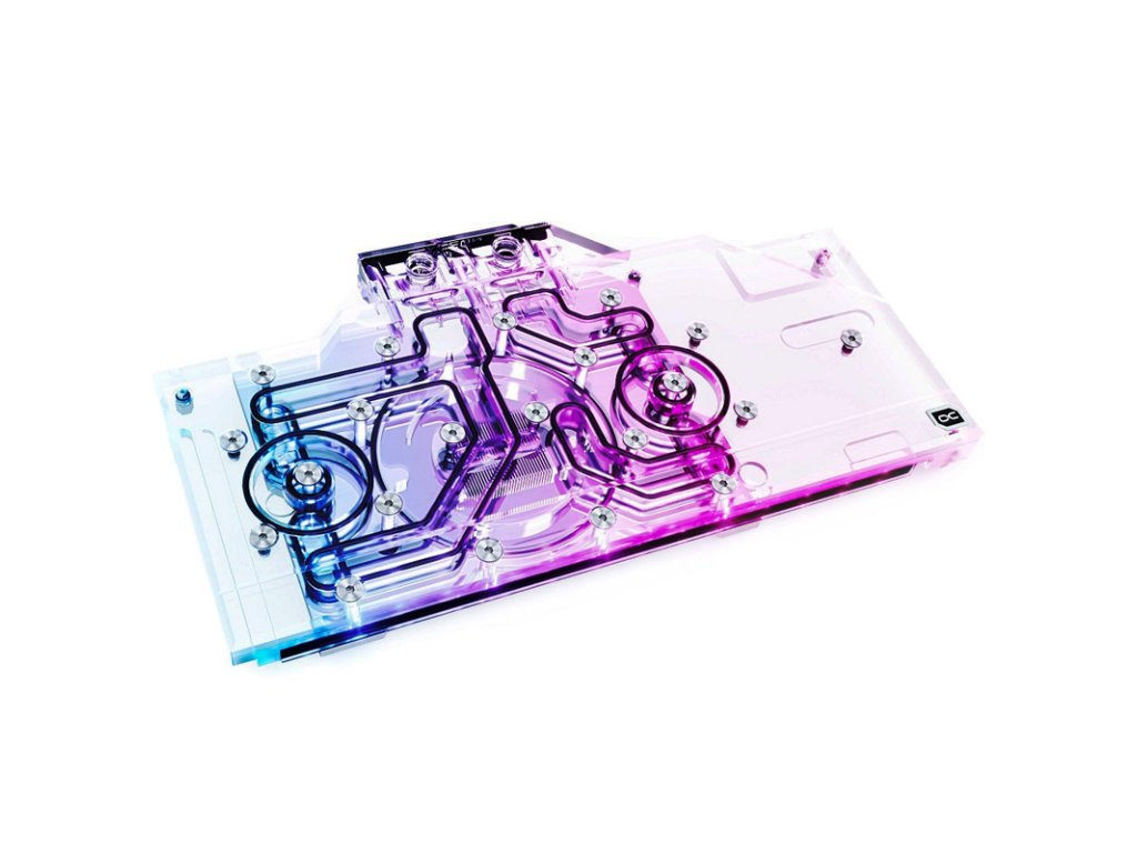 Veko sa skladá zpriehľadný akryl s integrovaným osvetlením RGB. Čierna zadná doska je vyrobená z hliníka, a preto zabezpečuje aj odvod tepla. Pripojovacia svorka na prednej strane má štyri závity G1/4 palca. Každý vstup a výstup je označený.