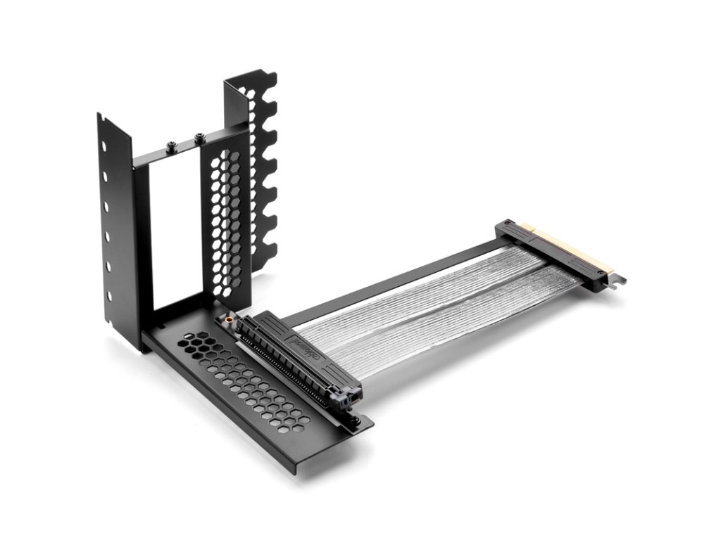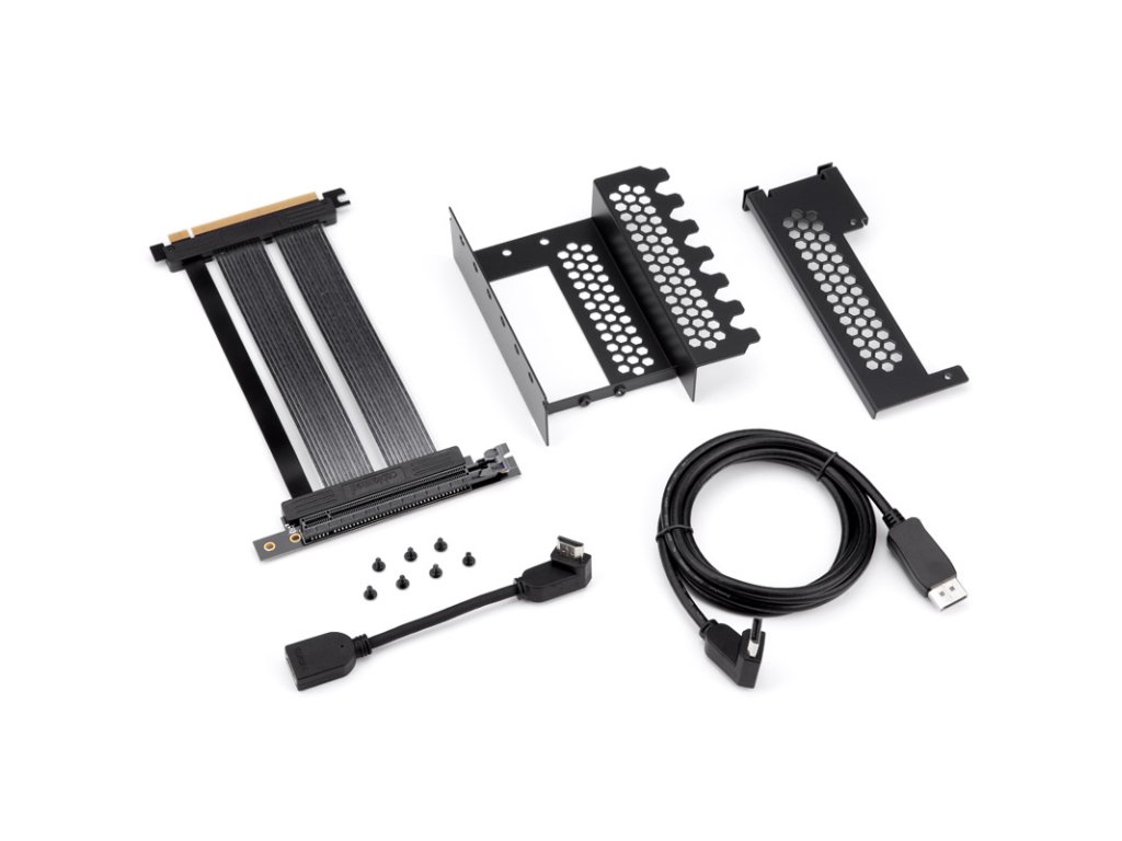 S touto prestavbovou súpravou, ktorá pozostáva zKábel Riser a držiak slotu PCIgrafickú kartu možno vložiť vertikálne doPuzdro so siedmimi slotmi PCI je možné nainštalovať. Na tento účel sa odstráni celý držiak slotu midi veže a nahradí sa držiakom slotu dodaným v súprave. Konzola má dva sloty PCI na pripojenie grafickej karty, ktoré môžu byť vysoké až tri sloty. Dodané gumové podložky stabilizujú grafický procesor. IntegrovanáRiser kábel je dlhý 210 mm a podporuje PCIe Gen4 x16. CableMod k tejto súprave dodáva aj kábel DisplayPort s dĺžkou 1,8 metra a adaptér HDMI.Technické údaje: