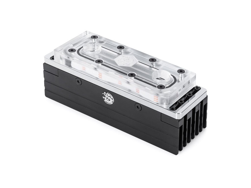 Blok DIMM je vyrobený z frézovaného akrylového skla a ponúkadve pripojenia s vnútorným závitom G1/4 palca. Spodná strana je vyrobená z poniklovanej medi, ktorá zabezpečuje dobrú tepelnú vodivosť. Stránkaintegrované osvetlenie DRGB je napájaný cez 3-pinový konektor RGB, a tak umožňuje aj synchronizáciu svetelných efektov prostredníctvom základnej dosky.