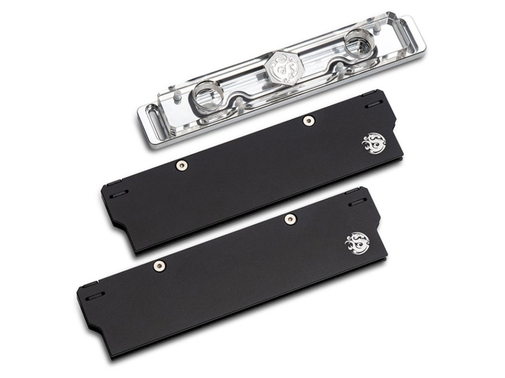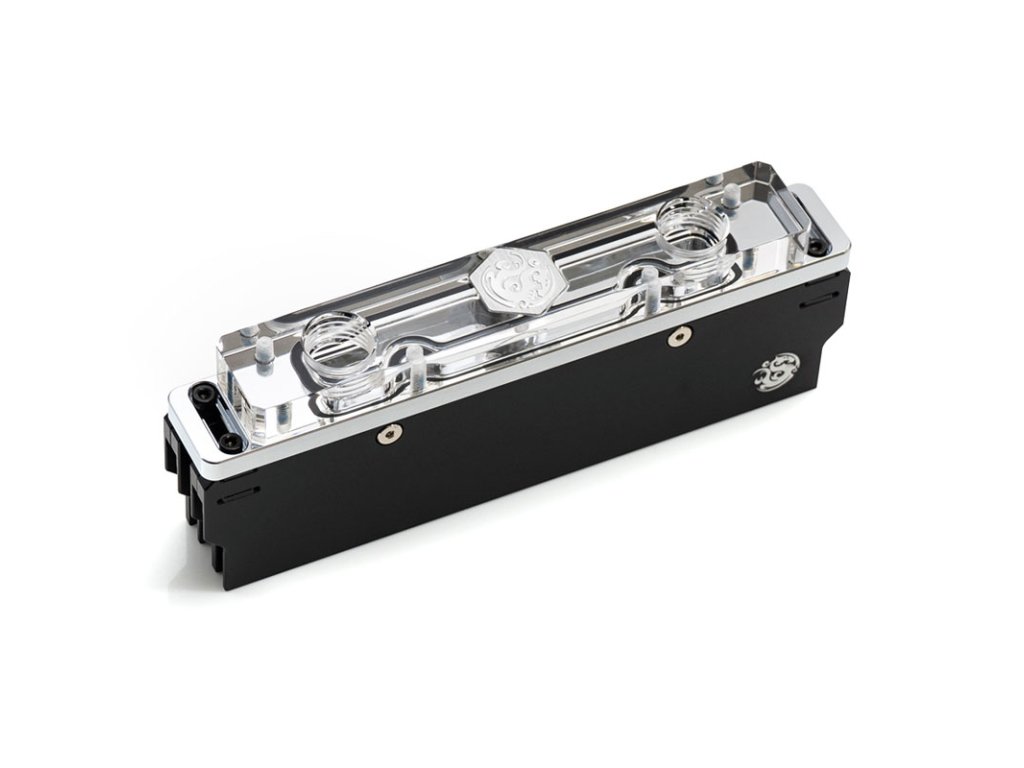 Blok DIMM je vyrobený z frézovaného akrylového skla a ponúkadve pripojenia s vnútorným závitom G1/4 palca. Spodná strana je vyrobená z poniklovanej medi, ktorá zabezpečuje dobrú tepelnú vodivosť.