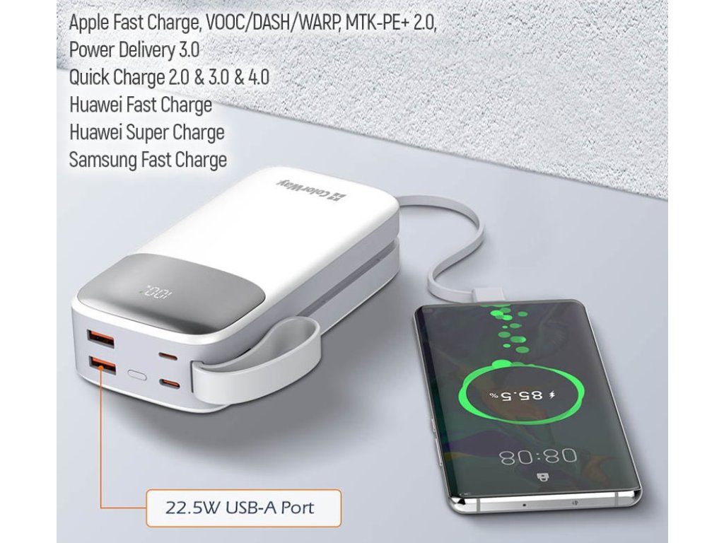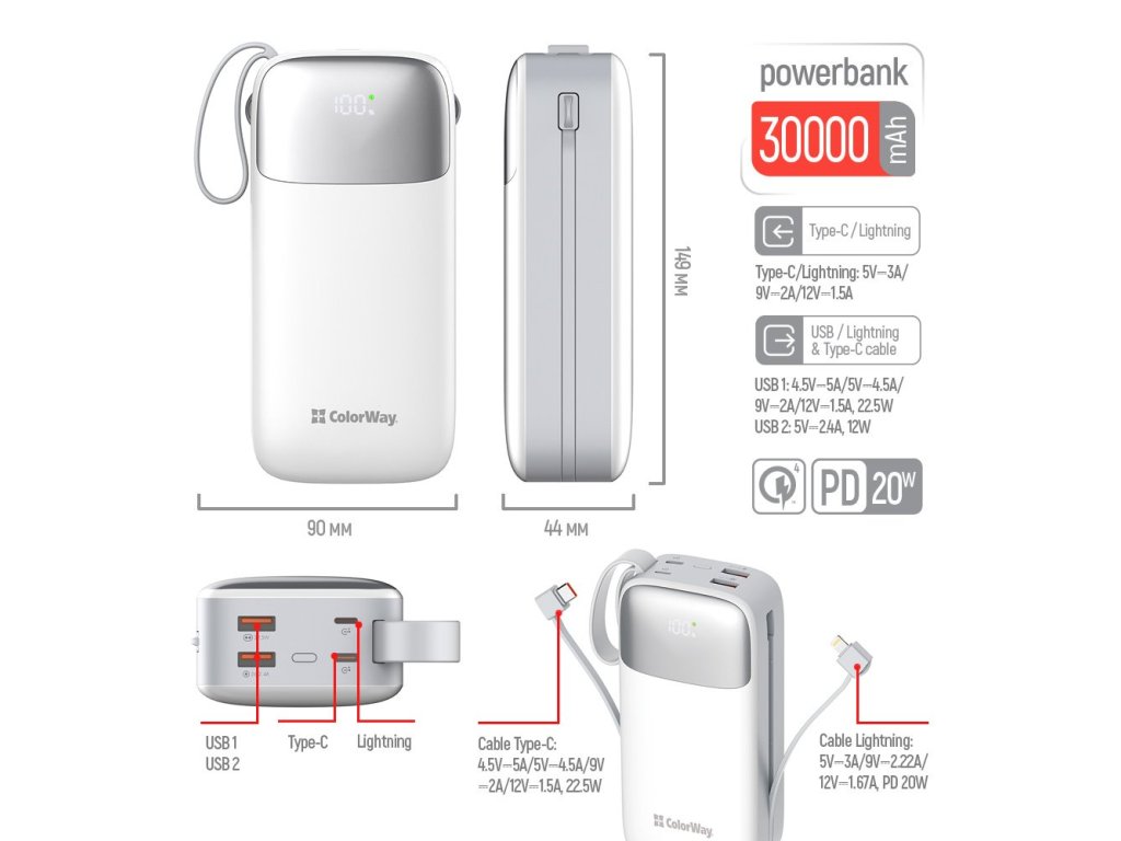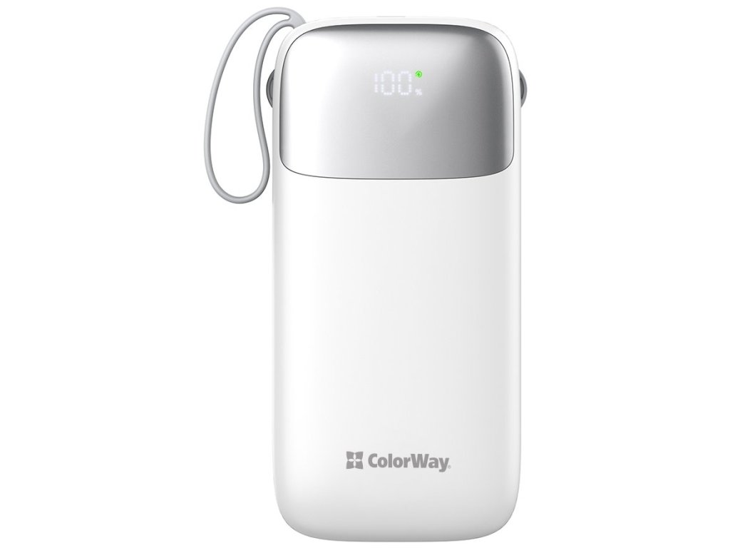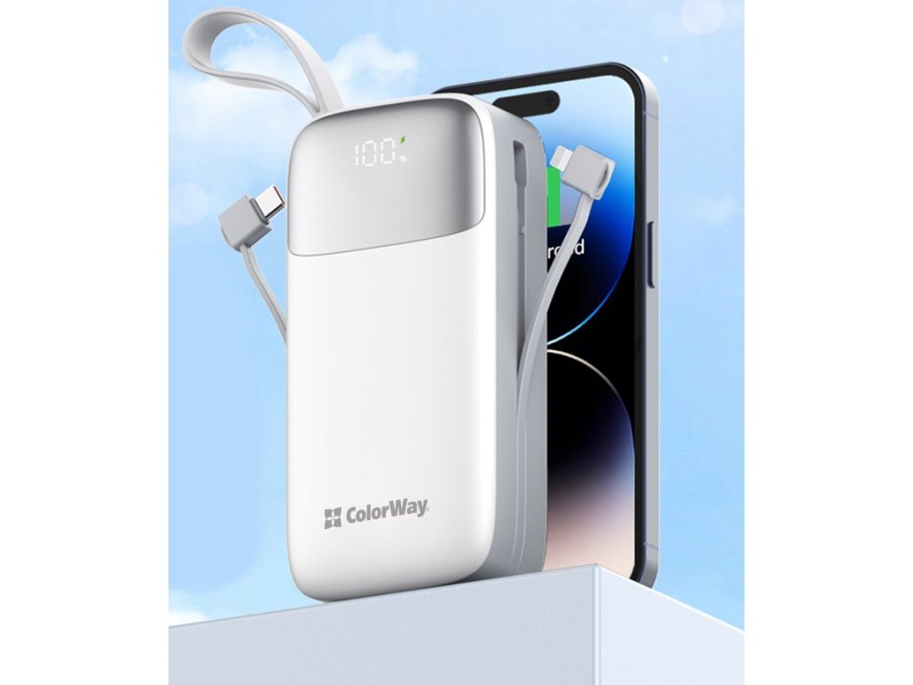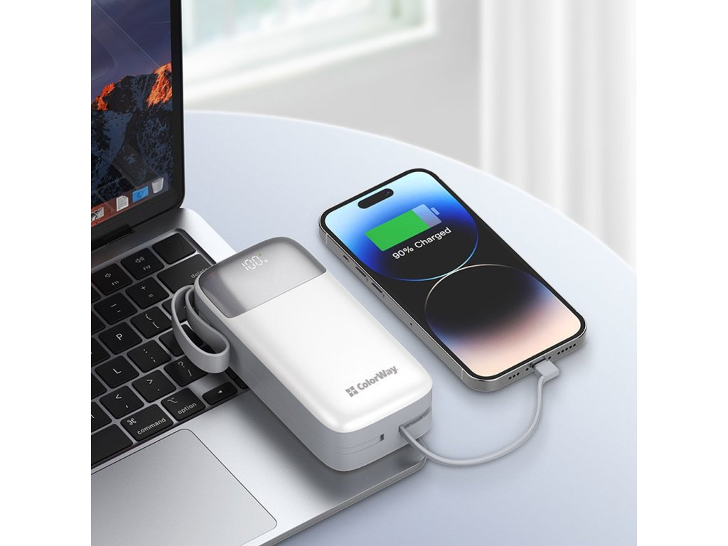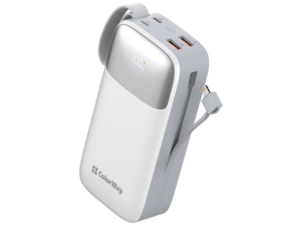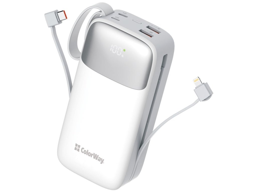 Podporuje širokou škálu protokolů rychlého napájení – jako například Power Delivery 3.0, Quick Charge, Apple Fast Charge a další. LED displej vám umožní sledovat míru nabití baterie. Powerbanka ColorWay je vybavena dvojicí USB portů a také dvěma integrovanými kabely s konektory Lightning a USB-C, díky čemuž je vysoce kompatibilní a umožňuje nabíjení celé řady zařízení, a to i klidně v jeden okamžik.