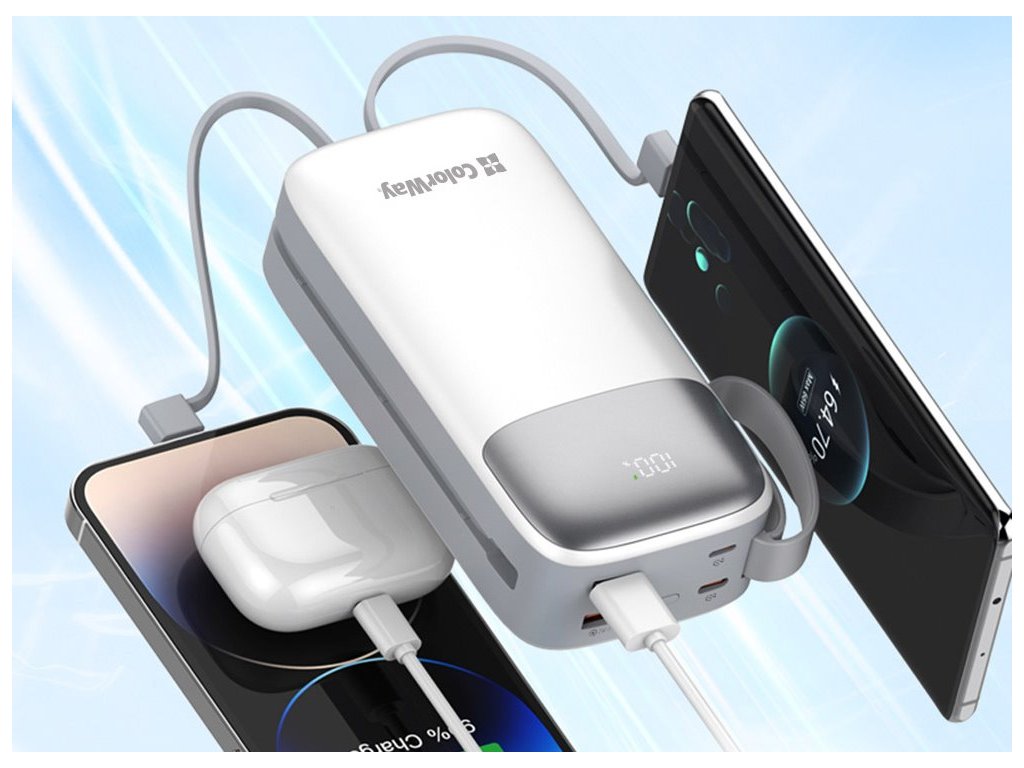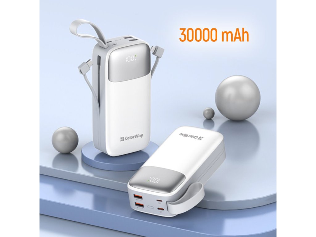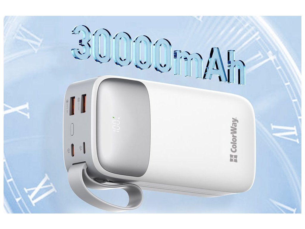 Powerbanka ColorWay CW-PB300LPA4WT-PDD představuje ideální řešení pro napájení mobilní elektroniky na cestách. Vyznačuje se vysokou kapacitou 30 000 mAh, díky čemuž je vhodná i pro opakované nabíjení zařízení, jako jsou smartphony, tablety, sluchátka, chytré hodinky apod.