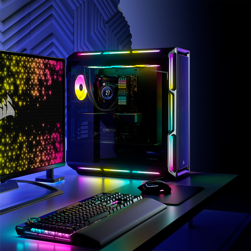 StránkaCorsair iCUE 5000T je midi tower pre základné dosky ATX s rozsiahlym RGB osvetlením. Takmer celá skriňa - predná časť, veko, základňa a predinštalované ventilátory sú obohatené o LED diódy, zatiaľ čo malé výrezy v ráme poskytujú LED diódam ešte viac priestoru na svietenie. Dvadsaťosem RGB LED diód možno ovládať individuálne, a preto sú vhodné najmä na prispôsobené RGB motívy. Čo sa týka osvetleniaCorsair iCUE 5000T aby žiadne oko nezostalo suché a žiadne želanie nesplnené. Po jednom bočnom paneli z tvrdeného skla a ocele - oba sú sklopné - dodávajú puzdru robustnosť a stabilitu, ale zároveň poskytujú výhľad na váš drahocenný hardvér. Oceľový bočný panel má ďalšie vzduchové otvory, ktoré podporujú prúdenie vzduchu v skrini. Sieťová vložka pod oceľovým panelom tiež filtruje prach. Tri predinštalované ventilátory Corsair LL12 RGB zabezpečujú účinný odvod tepla.