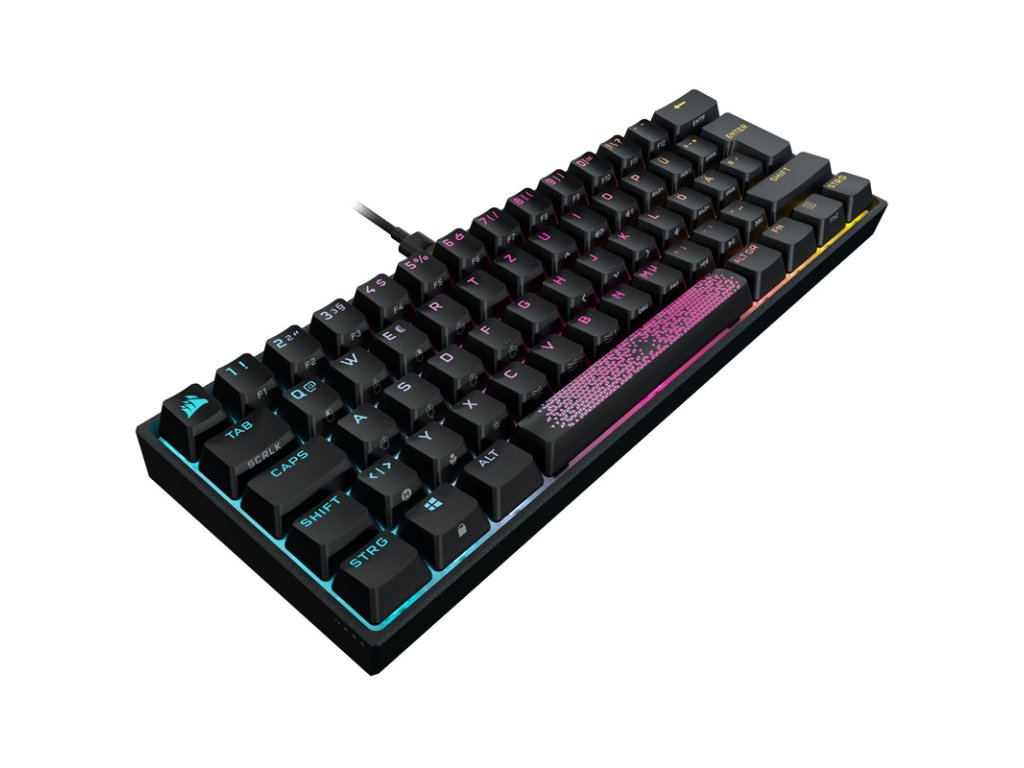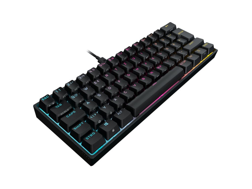 ZCorsair je herná klávesnica v 60 % prevedení TKL mini, a preto zaberá na stole veľmi málo miesta. ZabudovanáSpínače Cherry MX Speed Silver ponúkajú veľmi krátky čas odozvy a rýchlu reakciu vďaka krátkej dráhe. Sú preto ideálne na súťažné hry. Stlač klávesov je navyše úplne tichý.Kryt klávesnice je v jednoduchej čiernej farbe s bielymi potlačenými klávesmi. Každého však zaujme voliteľné prepínateľné osvetlenie RGB. To je možné synchronizovať s kompatibilnými zariadeniami Corsair prostredníctvom softvéru iCUE.