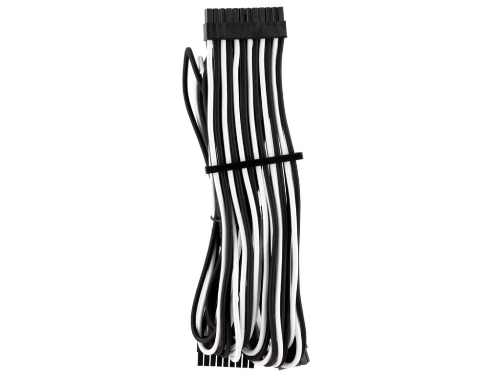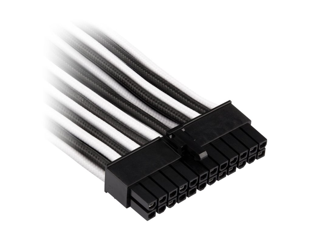 Corsair ponúka s týmto24-pinový kábel ATX v bielej/čiernej farbe ponúka praktické a mimoriadne štýlové riešenie na pripojenie napájacieho zdroja a základnej dosky, ktoré je kompatibilné s napájacími zdrojmi Corsair zo série RMi, RMx a HX (Platinum) alebo s napájacími zdrojmi Corsair typu 4. Každá jednotlivá žila tohto kábla bola obalená vysokokvalitným materiálom paracord a jebez zmršťovacej hadičky bezpečne pripojené k zástrčkám. Prípojky majú čiernu povrchovú úpravu, ktorá vytvára elegantný kontrast a štýlový dizajn.24-pinový kábel ATX s celkovou dĺžkou 610 milimetrov možno pripojiť k napájacej jednotke prostredníctvom konektora 18+10 a k základnej doske prostredníctvom 24-pinového konektora. Má tiežprídavné integrované kondenzátory na vyhladzovanie napätia v 12-voltovej lište. Predinštalovaný 24-drážkový káblový hrebeň zabezpečuje dokonale zarovnané vodiče a vytvára tak absolútne čistý dizajn káblov.