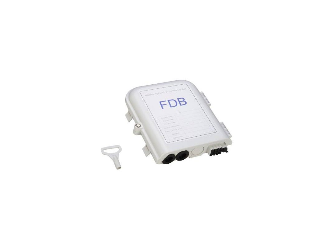 Box DATACOM 8 vlákenVodotěsný venkovní nástěnný FTT x box. Zajištění dvířek na plastový klíč. Včetně kazet a hřebínků, spojky nejsou součástí balení. Box má certifikaci IP65