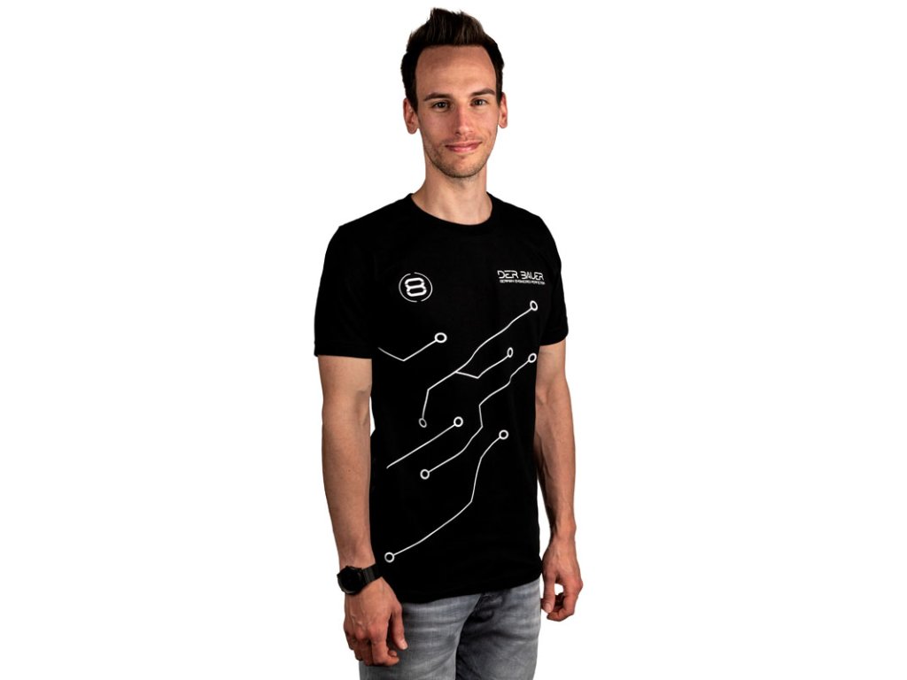 Biely vzor na prednej strane čiernej košele jeVodiče na doske plošných spojov podľa vzoru. Materiál je 100 % bavlna a tento model sa dodáva vo veľkosti "S".