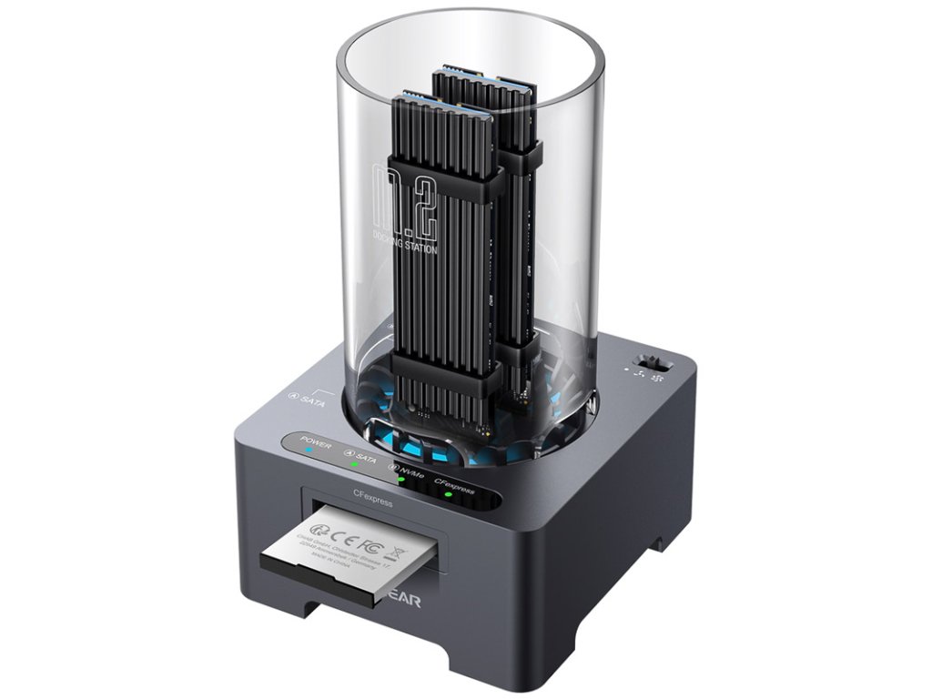 Dokovacia stanica so šedým uchom je dokonalým riešením na prenos dát medzi diskami SSD M.2 a pamäťovými kartami so štandardom CFexpress. Je možné dosiahnuť rýchlosť až 10 Gbit/s.