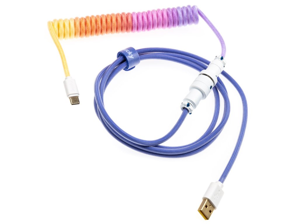 SPremicord ponukyDucky štýlový spôsob, ako prezentovať svoju mechanickú hernú klávesnicu. SamozatváracíŠpirálový kábel je odĺžka 1,8 m a je vybavený pružným nylonovým plášťom. Nielenže dobre vyzerá, ale chráni aj pred zlomením kábla a ľahko kĺže po stole. Opláštenie tu ponúkaných káblovFarebný variant Afterglow zobrazuje jemný farebný gradient od fialovej po žltú, zatiaľ čo spoje sú matne biele.Kábel je vybavenýPort USB-C na jednej strane a port USB-A na druhej strane na druhej strane, takže je kompatibilný s najnovšími klávesnicami Ducky. Päťkolíkový letecký konektor v pochrómovanom kryte spája obe časti kábla. Ak vlastníte rôzne Premicordy, môžete ich navzájom kombinovať a vytvárať nové zvuky. StránkaDucky Premicord spĺňa aj tie najvyššie nároky vďaka vysokej kvalite spracovania aspoľahlivo zabezpečuje rýchly prenos signálu cez USB 2.0 medzi klávesnicou a počítačom.