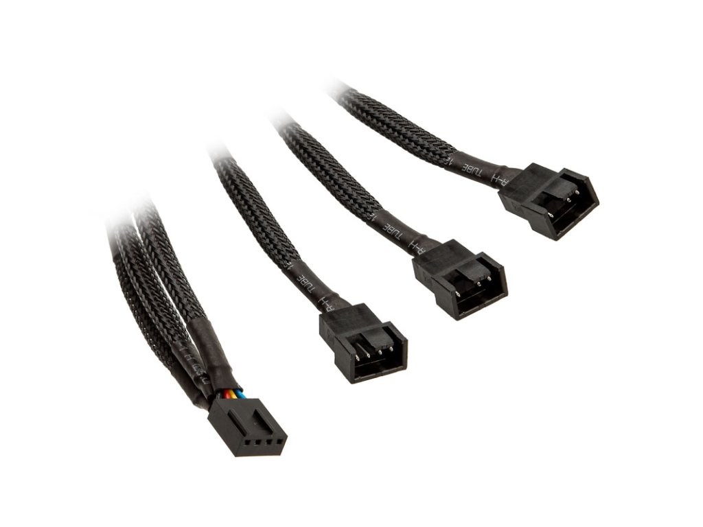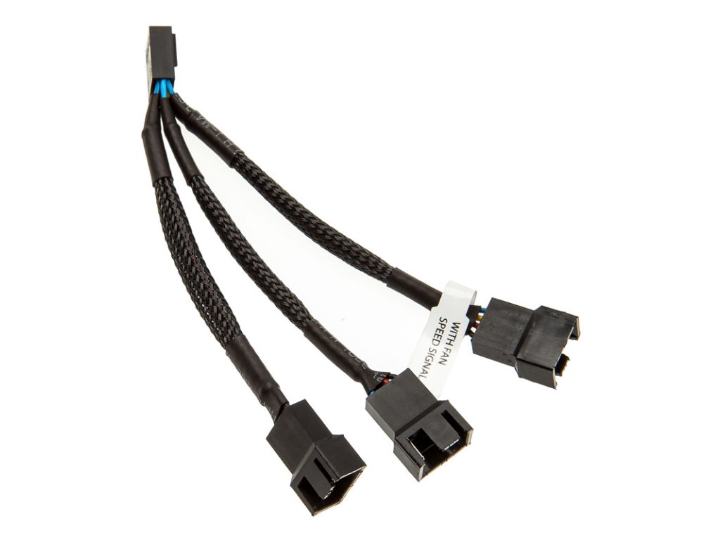 Signál otáčkomera sa prenáša iba z jedného z troch pripojiteľných ventilátorov na základnú dosku. Celková dĺžka 3-cestného rozdeľovača PWM od spoločnosti EK Water Blocks je približne 10 cm; káblové zväzky sú obalené čiernou farbou, ktorá je príjemná na pohľad a umožňuje nenápadné uloženie káblov v skrinke.