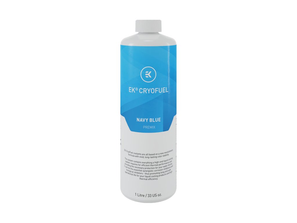 Chladiaca kvapalina pripravená na použitie pre systémy vodného chladenia v námorníckej modrej farbe od spoločnosti EKWB. Fľaša obsahuje 1000 mililitrov zmesi pripravenej na použitie zo série EK-CryoFuel s inhibítormi biologického rastu a ochranou proti korózii s vysokou materiálovou kompatibilitou a vysokokvalitnou pigmentáciou pre intenzívny farebný lesk.Prehľad vlastností chladiacej kvapaliny EK-CryoFuel: