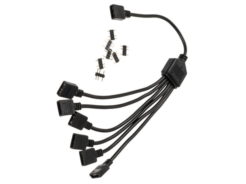 SEK-D-RGB 6-cestný 3-kolíkový rozdeľovací kábel D-RGB rozšírenéVodné bloky EK pridala do svojej ponuky príslušenstva pre nadšencov osvetlenia ďalší produkt. Ak chcete svoj počítač poriadne osvetliť, rýchlo narazíte na hranice možností, pretože počet RGB headerov na základných doskách je zvyčajne veľmi obmedzený. S týmto rozdeľovacím káblomaž šesť produktov RGB LED môže byť pripojený len k jednému RGB konektoru.SCelková dĺžka 30 cm rozdeľovací kábel slúži aj ako predĺženie. Kábel je dlhý 16,5 cm až po rozdeľovač. Každý zo šiestich pokračujúcich káblov má dĺžku 13,5 centimetra. Z hľadiska farby je kábel jednoduchoČierna sa konala. Okrem kábla, ktorý je vybavený zásuvkami, sú tu ajsedem zástrčkových adaptérov zahrnuté v rozsahu dodávky. Rozdeľovací kábel je kompatibilný so súčasnými základnými doskami sASUS Aura Sync, GIGABYTE RGB Fusion, MSI Mystic Light a ASRock RGB LED.