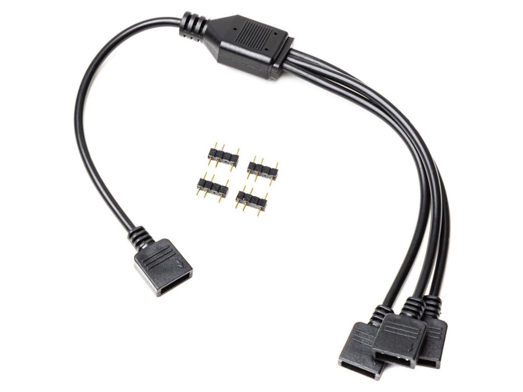 Pomocou tohto čierneho rozdeľovacieho kábla môžeteaž tri produkty RGB LED môže byť pripojený len k jednému RGB konektoru. Vzhľadom naCelková dĺžka 30 cm slúži aj ako predĺženie. Kábel je dlhý 16,5 cm až po rozdvojku. Každý z troch pokračujúcich káblov má dĺžku 13,5 cm.Okrem kábla, ktorý je vybavený zásuvkami, sú tu ajštyri adaptéry na zástrčky zahrnuté v rozsahu dodávky. Rozdeľovací kábel je kompatibilný so všetkými zariadeniami s 3-pinovým konektorom RGB.