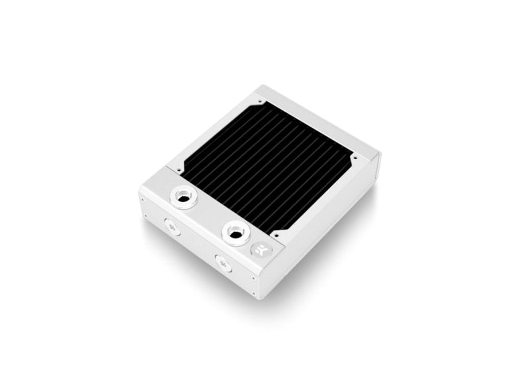 StajňaHliníkové koncovky s kontrastným strieborným povrchom dodať chladiču vysokokvalitný vzhľad. Pre povrchovú úpravu robustných oceľových bočných častíVodné bloky EK na odolnú pololesklú bielu farbu. Samotné lamely sú natreté matnou čiernou farbou s vysokým súčiniteľom tepelnej vodivosti.Vďaka dodaným skrutkám je tento chladič kompatibilný so 120 mm ventilátormi, ktoré majú štandardnú hrúbku 25 mm.