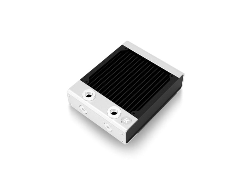 StajňaHliníkové koncovky s kontrastným strieborným povrchom dodať chladiču vysokokvalitný vzhľad. Pre povrchovú úpravu robustných oceľových bočných častíVodné bloky EK na odolnú pololesklú čiernu farbu. Samotné lamely sú natreté matnou čiernou farbou s vysokým súčiniteľom tepelnej vodivosti.Vďaka dodaným skrutkám je tento chladič kompatibilný so 120 mm ventilátormi, ktoré majú štandardnú hrúbku 25 mm.
